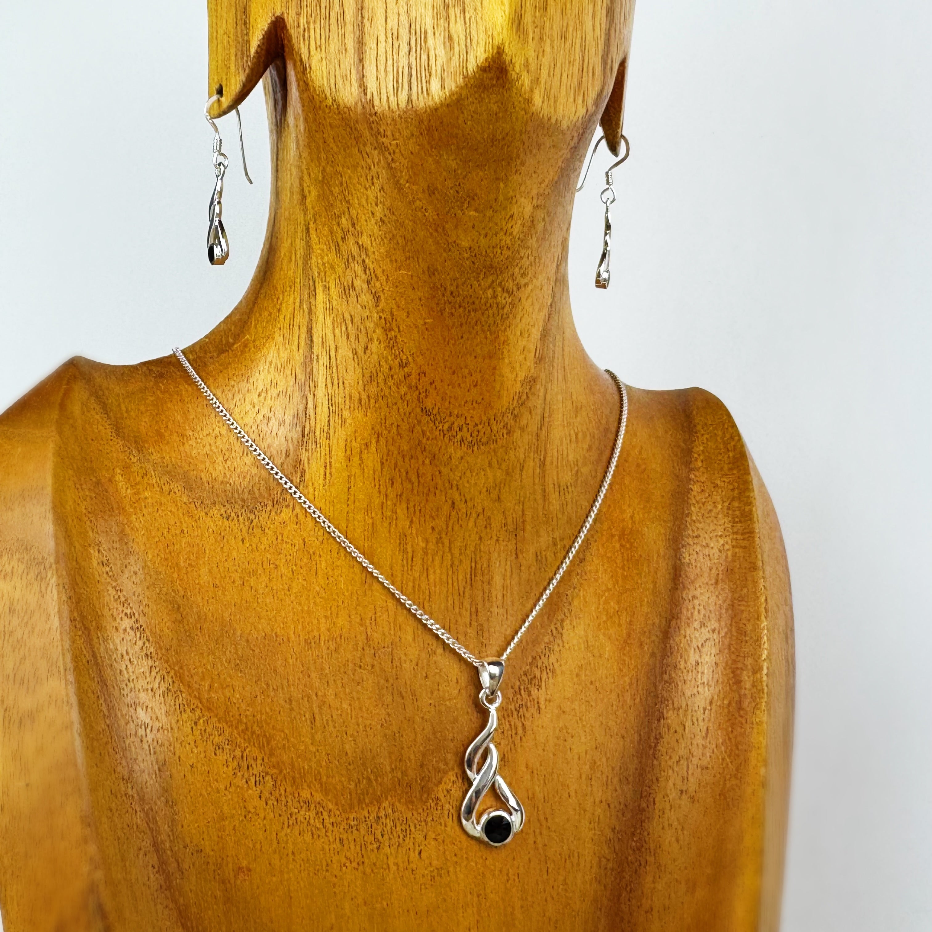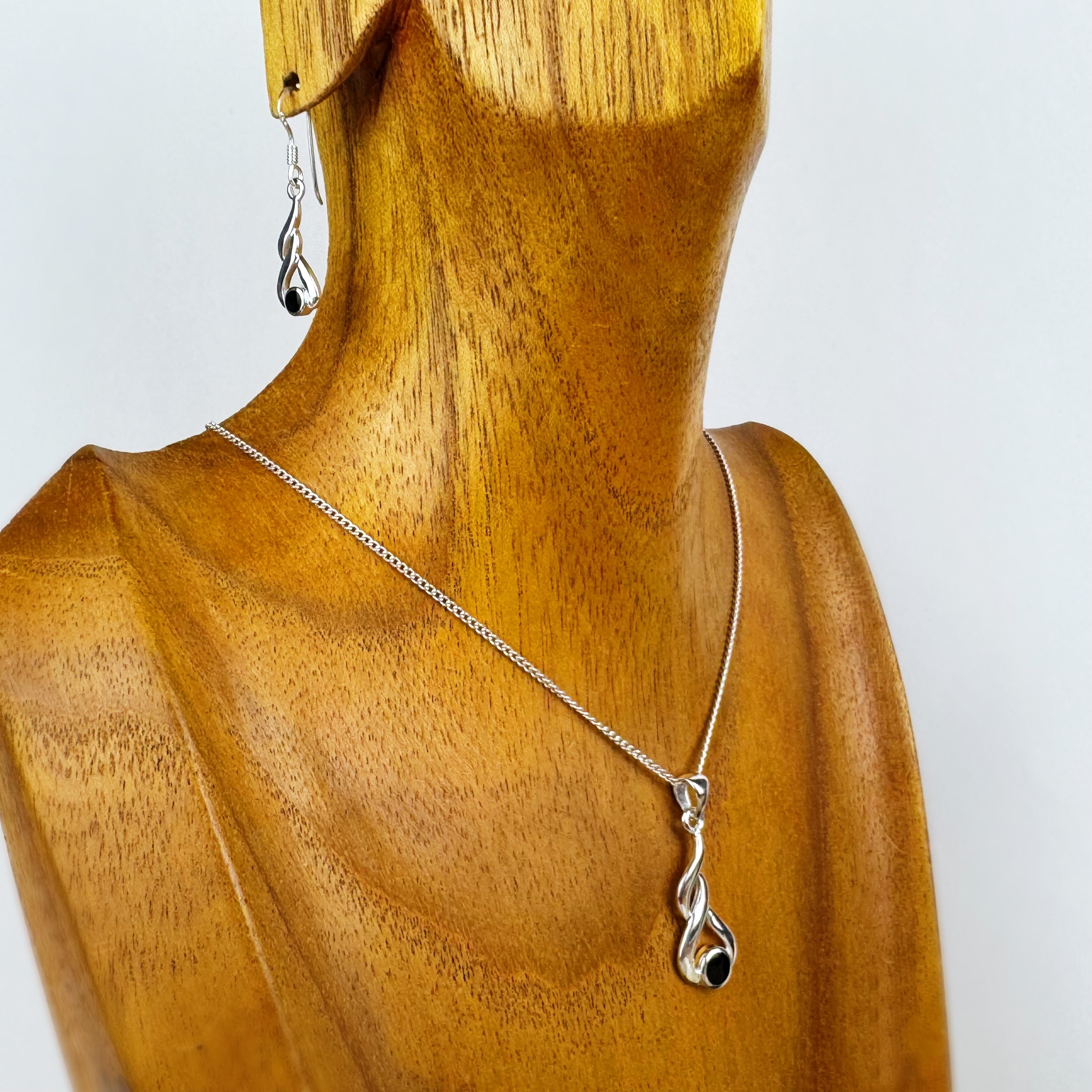 A tiny circle of black Onyx sits perfectly within a twist of entwined shining Silver. This dainty pendant & drop earring design is so versatile it is sure to be one you'll love.
