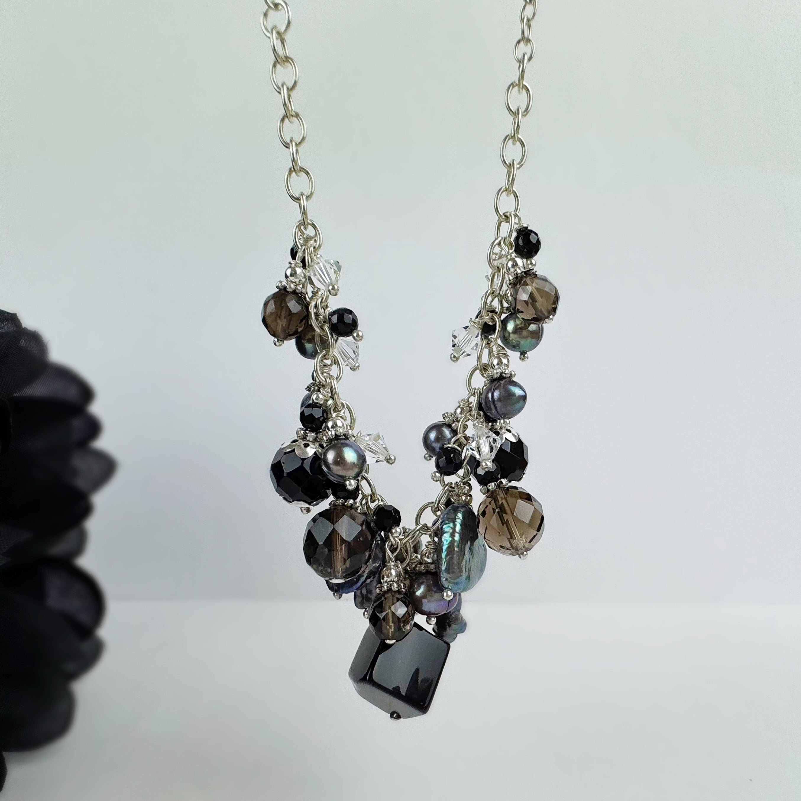 Tempting drops of dark semi-precious stones of Black Onyx, Smokey Topaz combine with dark grey Freshwater Pearls for faceted allure in this handcrafted, unique Silver statement necklace. The perfect accessory for elegant parties & evening dinner dates.