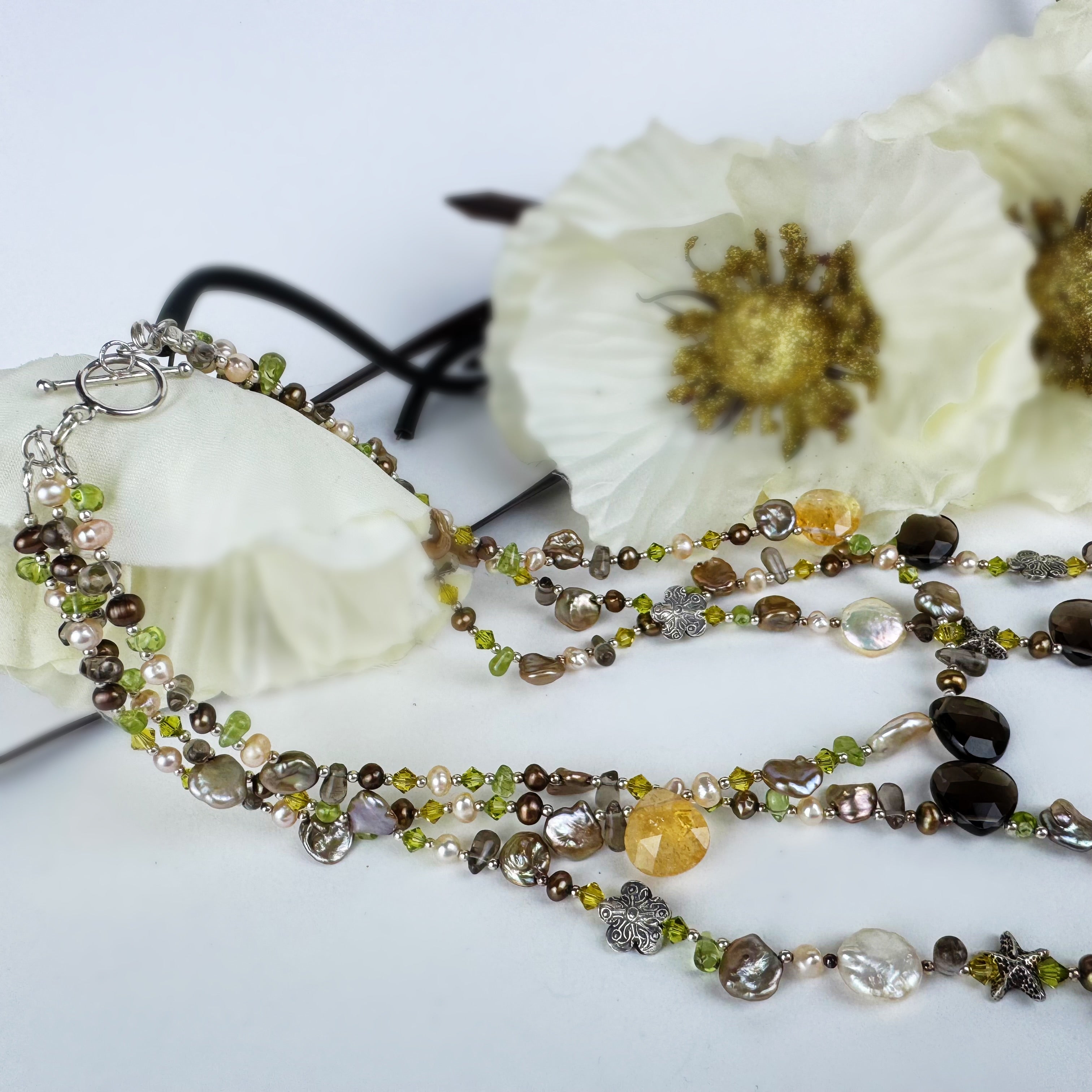 Yellow Citrine & Smokey Quartz droplets, Freshwater Pearls, Peridot, Crystals & sculpted Silver flowers & starfish combine to create a breathtakingly beautiful, three strand handcrafted necklace. with a Sterling Silver T-bar fastening.