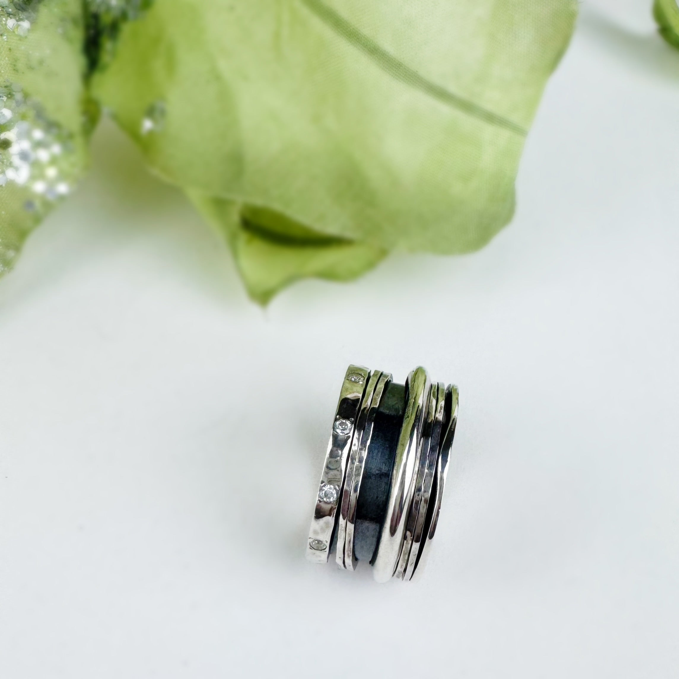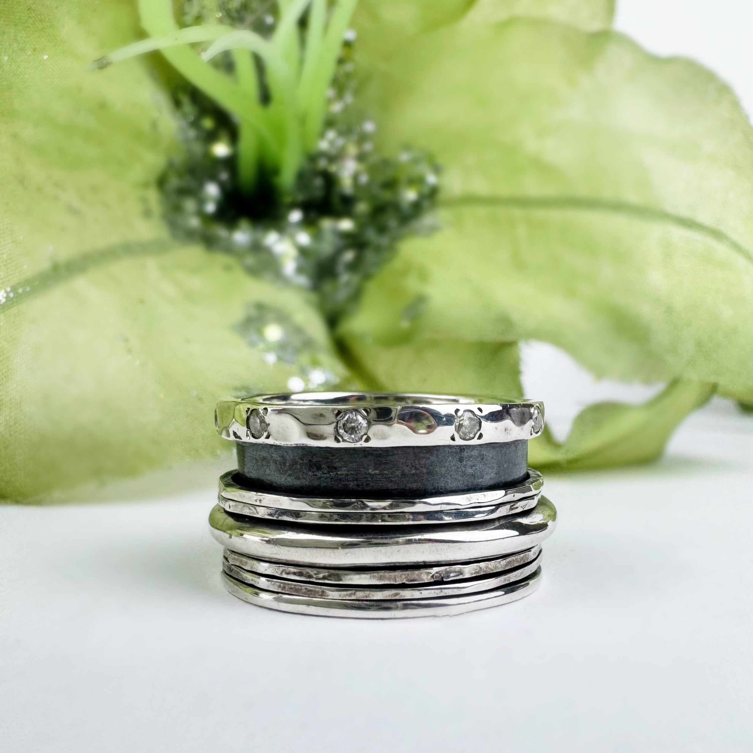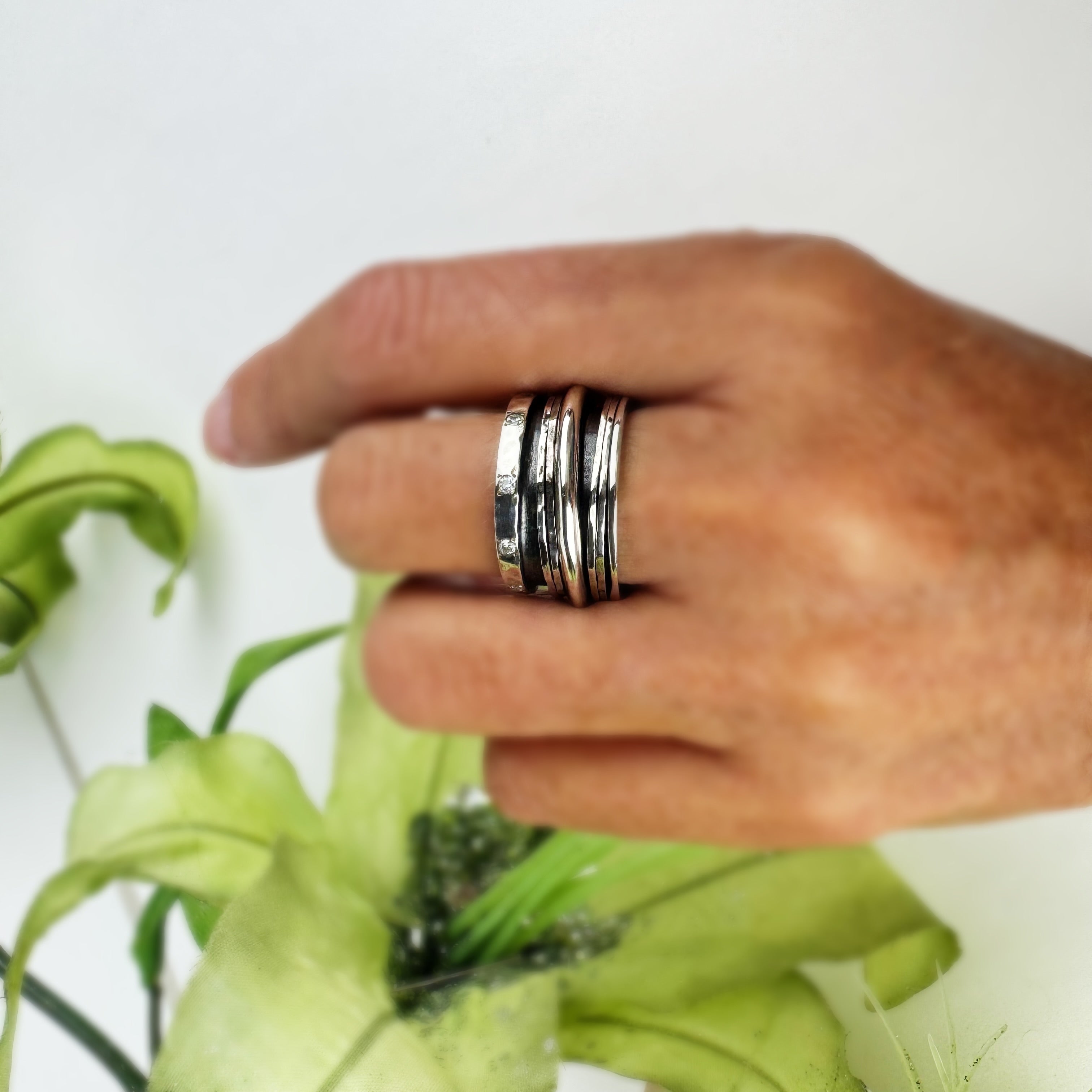 Like music to your ears this beautiful handmade, chunky Silver band ring dotted at one end with sparkling stones of white Cubic Zirconia, plays with the five free spinning bands around it's oxidised centre.