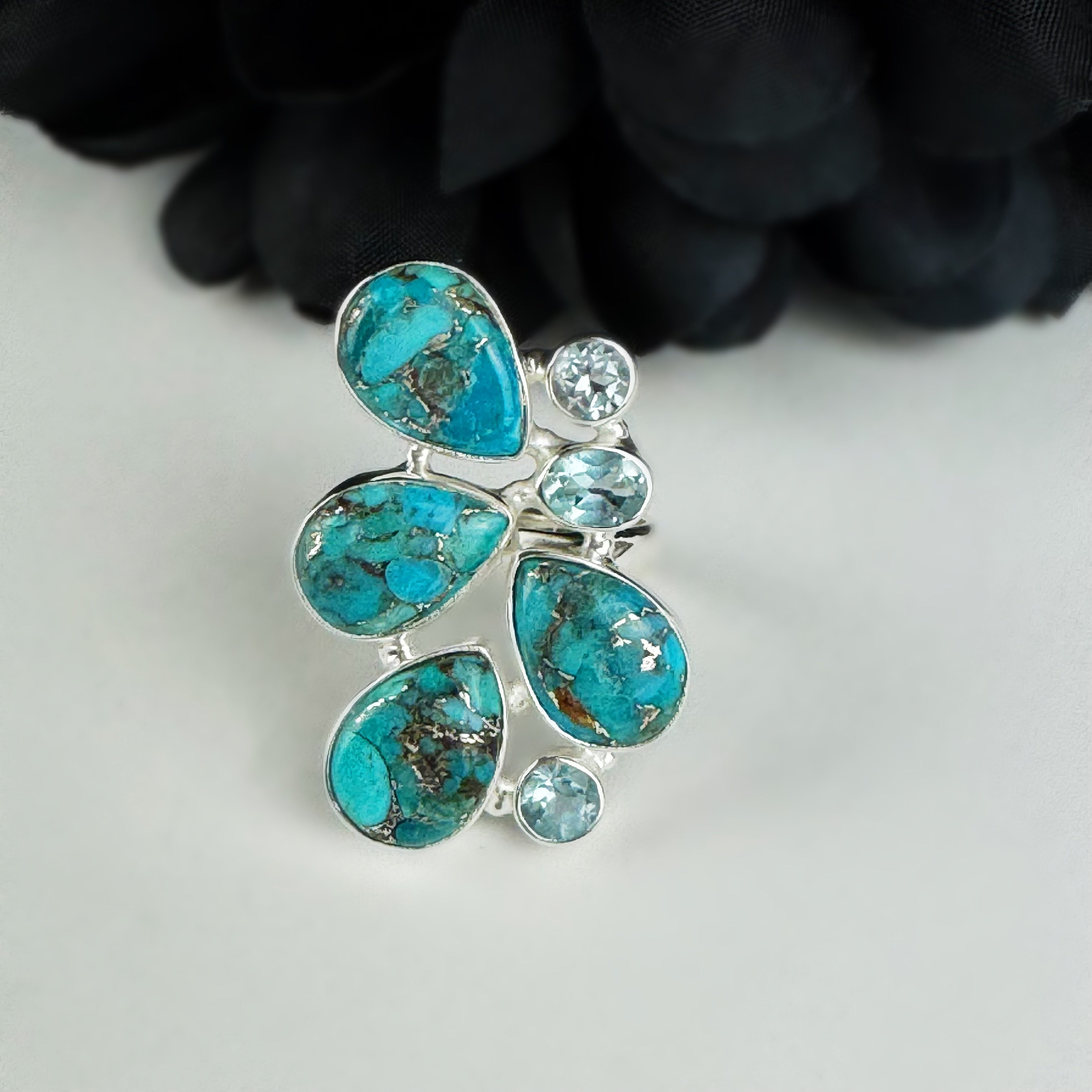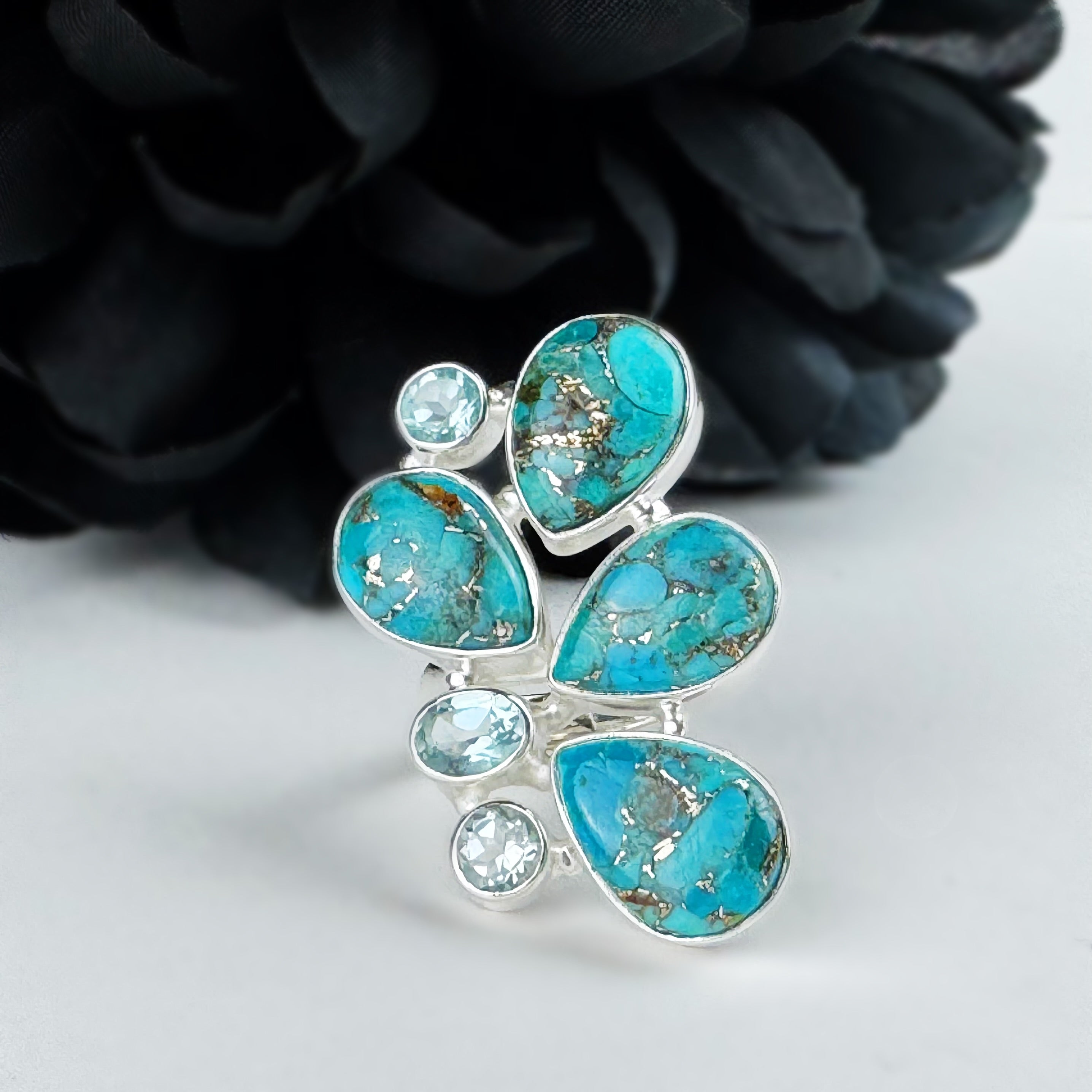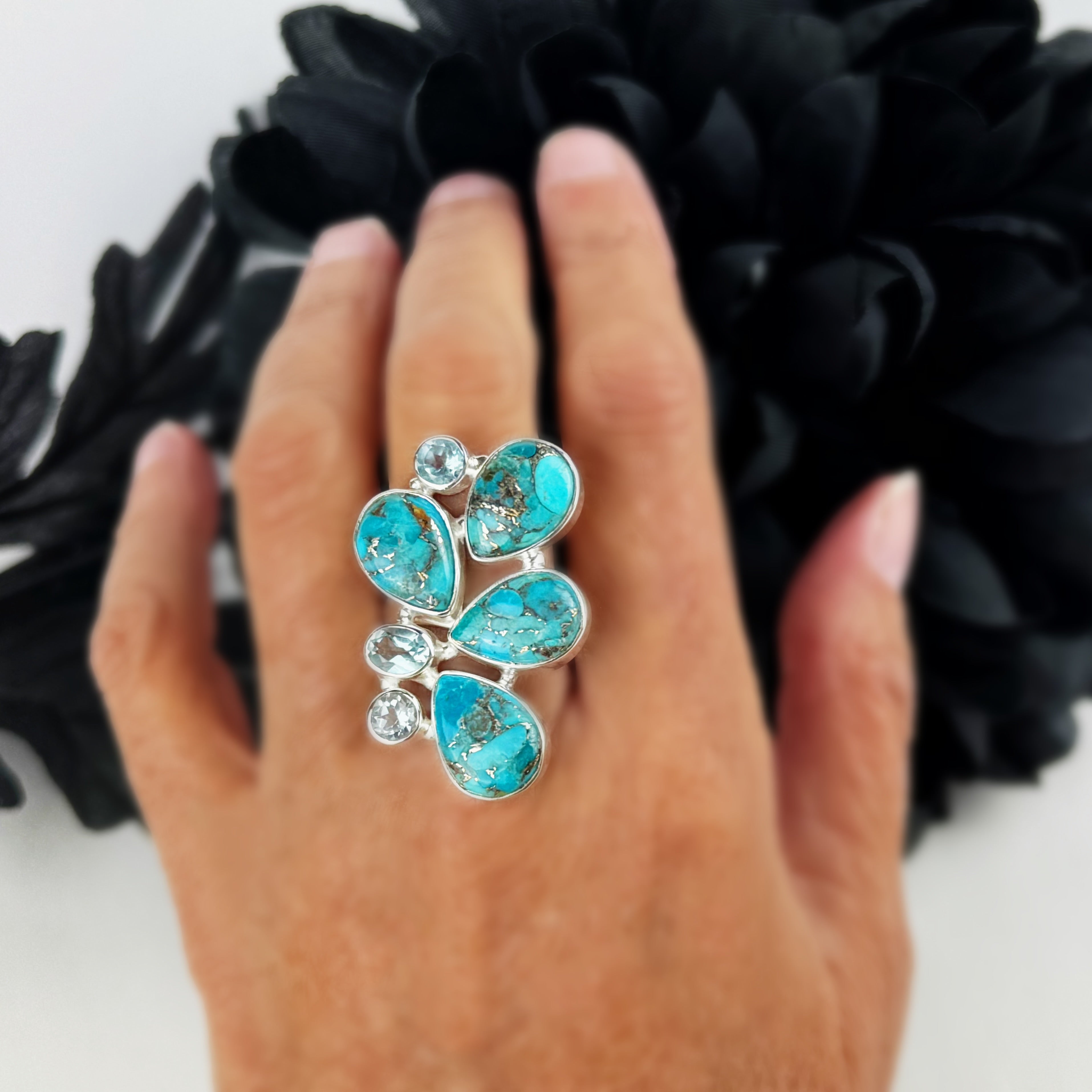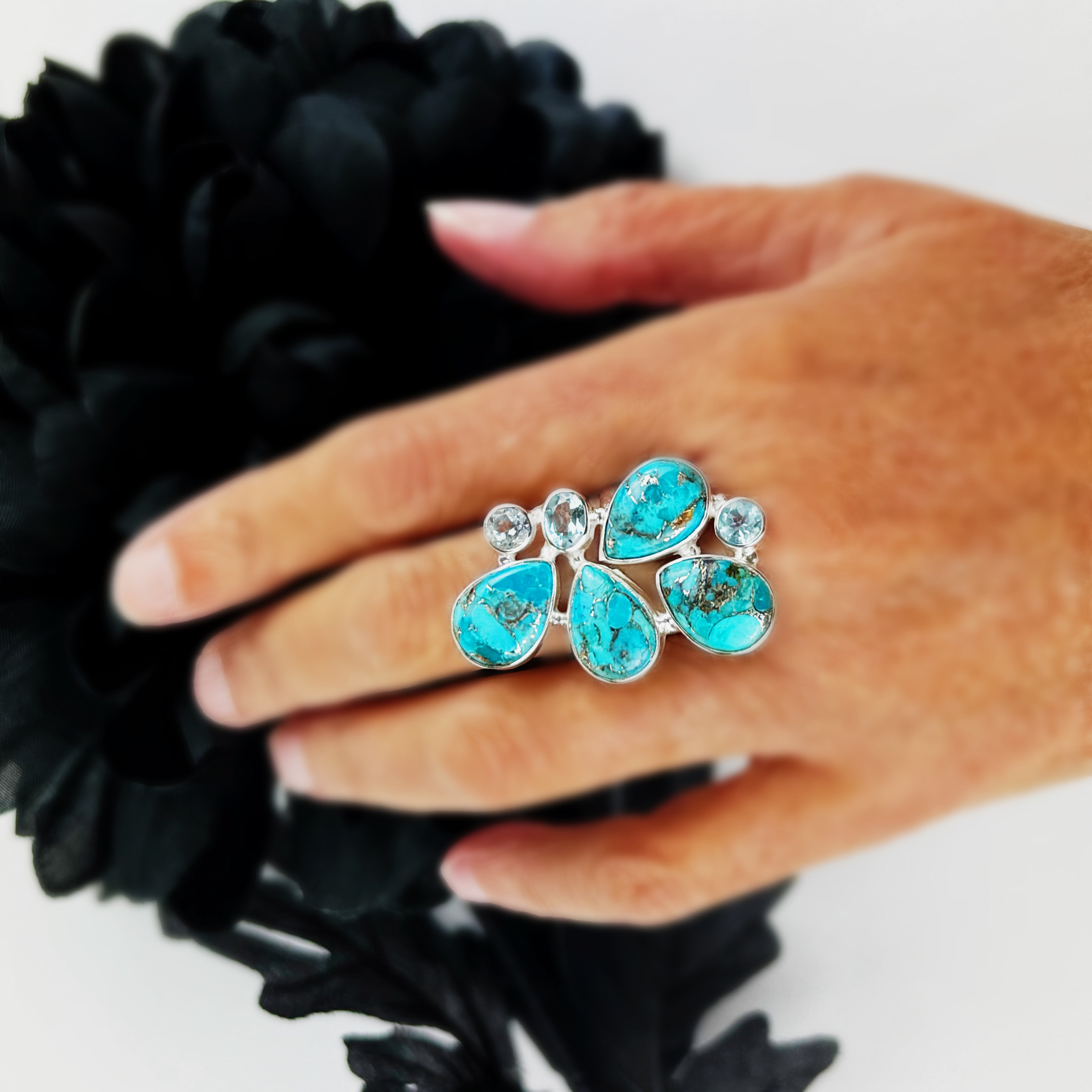 Handcrafted & unique, this stunning ring is so elegant & a perfect statement piece. Set in Silver, polished stones of bright blue Copper Turquoise feature with smaller faceted stones of light Blue Topaz adding extra head turning sparkle.
