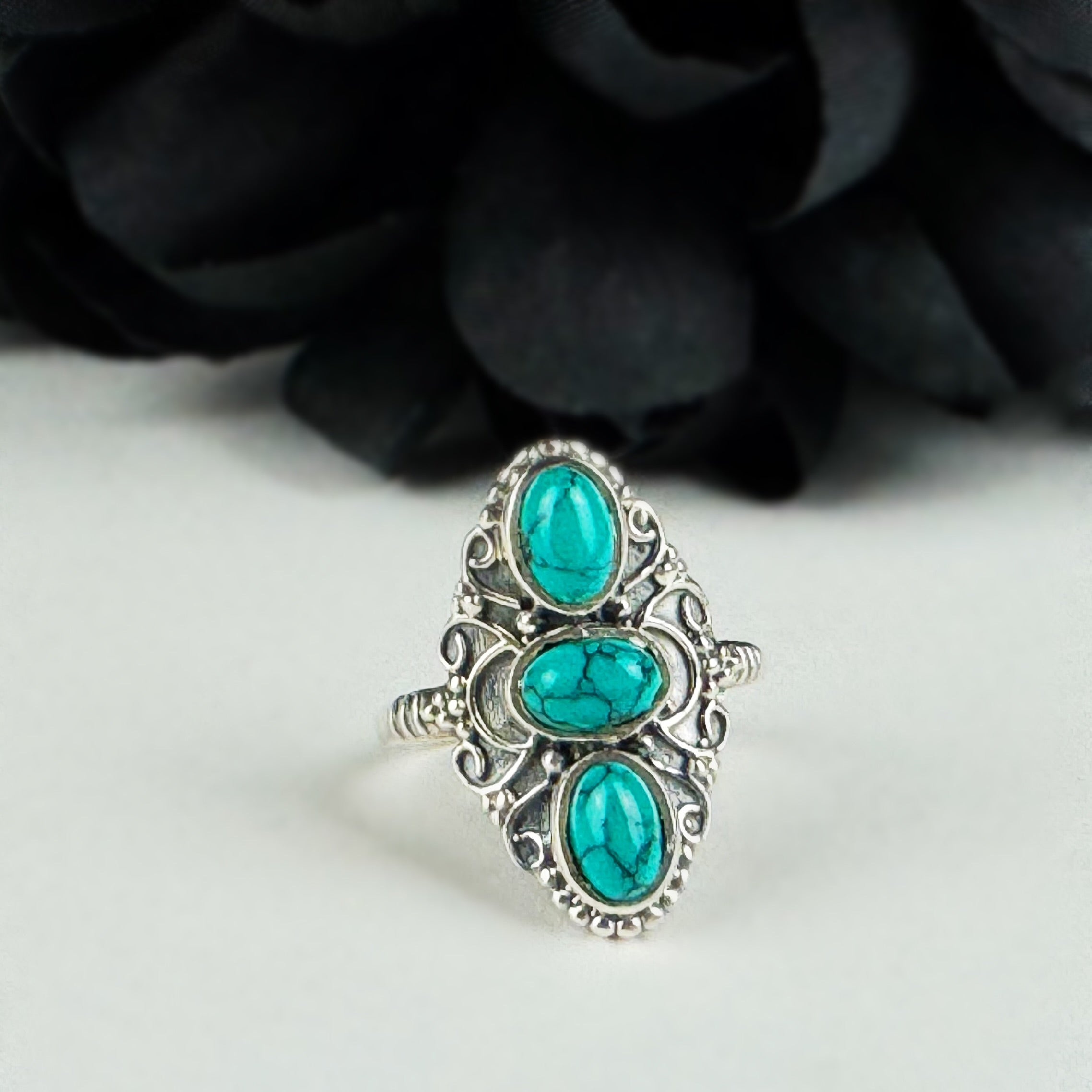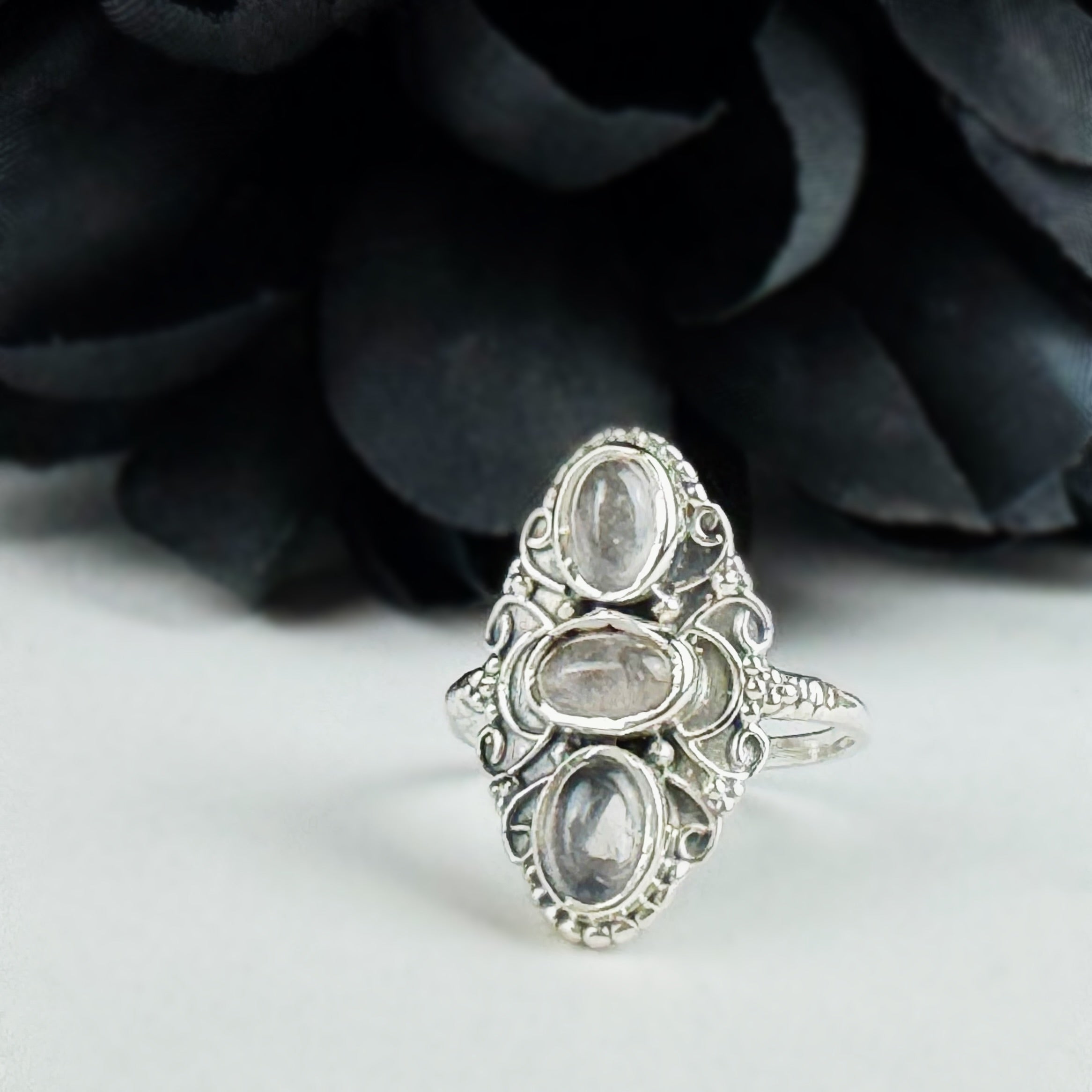 This dainty, contemporary, vintage style stone set Silver ring is beautifully crafted. It looks lovely on it's own & fab stacked with others to add unique boho appeal to your favourite collection.