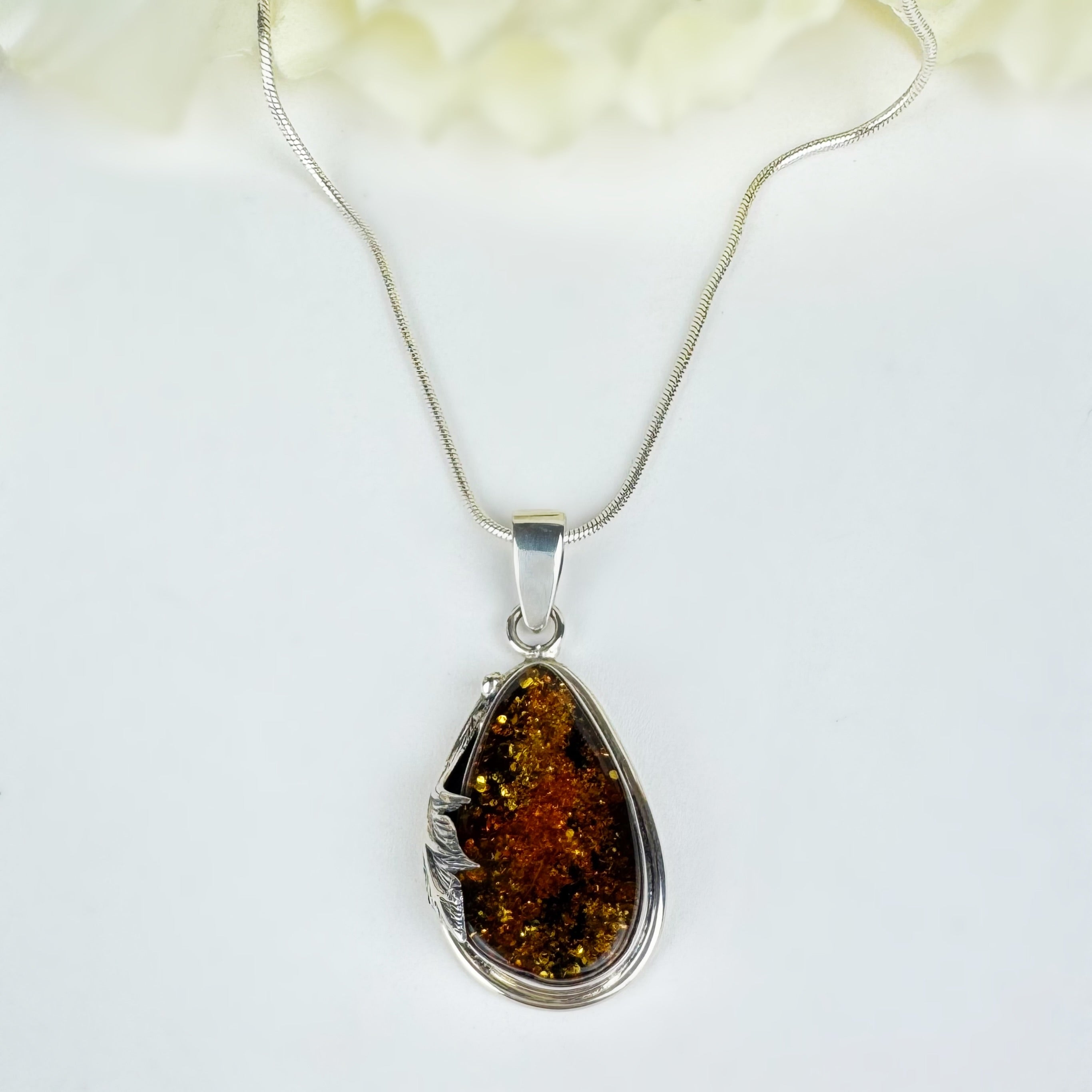 Rich golden Baltic Amber is set in the most lovely, handcrafted, Silver Art Nouveau style setting. Adorned at the side with scrolling leaves this beautiful, natural stone pendant bears witness to an ancient time.