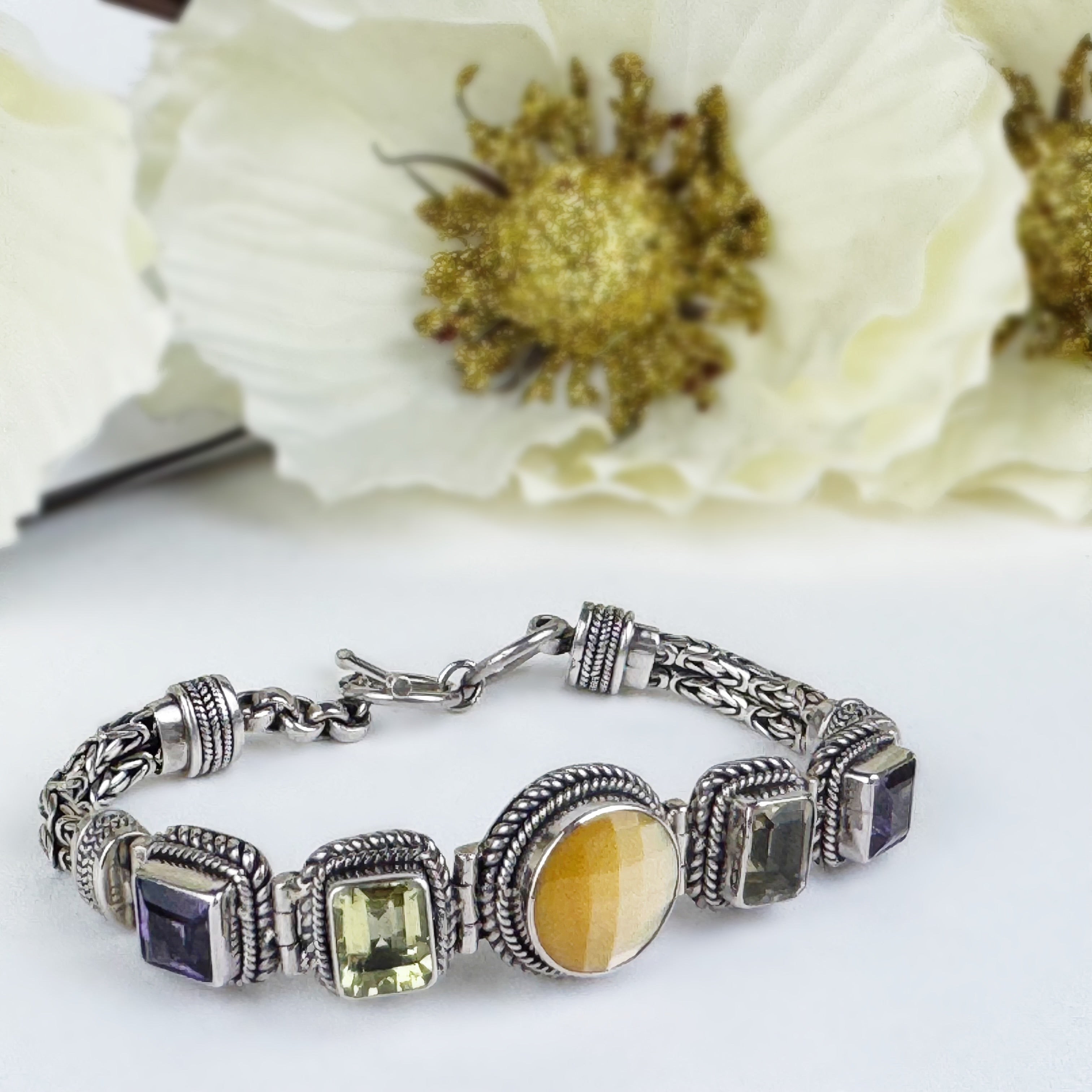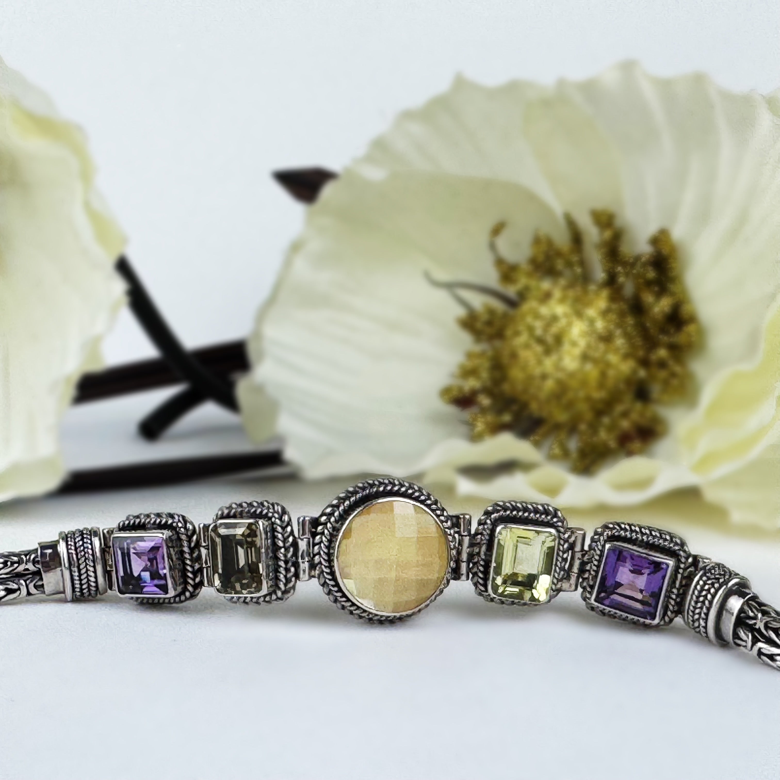A Balinese work of art. This handcrafted bracelet is a gorgeous combination of plaited Silverwork, oxidised & enhanced with bright faceted gemstones of lemon yellow Citrine & Mother of Pearl teamed with contrasting Amethyst  to brighten your days.