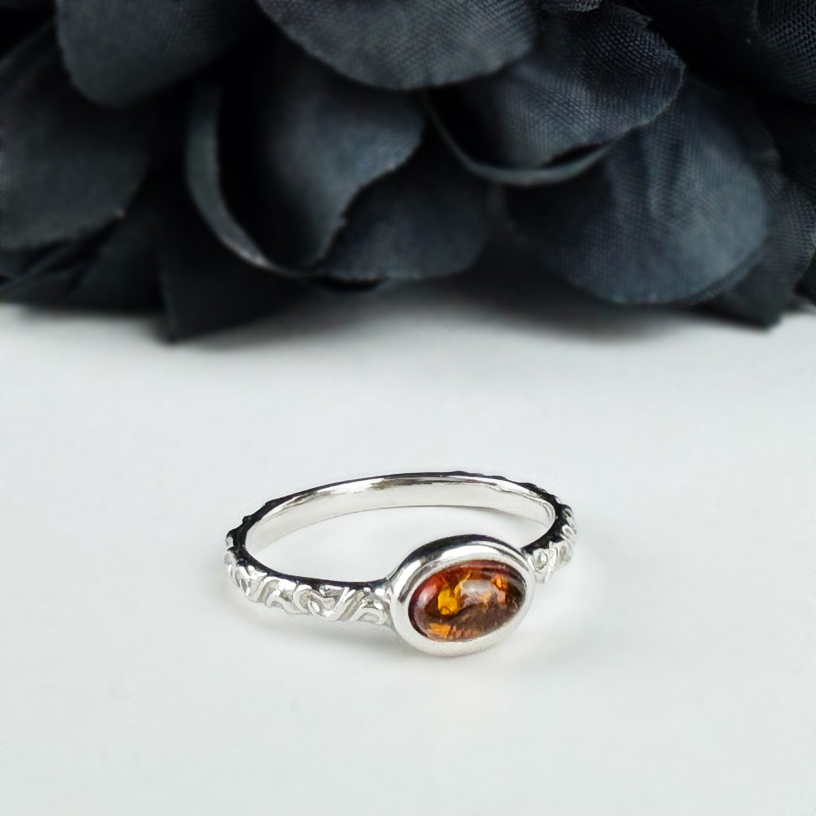 This dainty Amber & Silver ring has a charming scroll pattern on the band that adds a vintage twist to your look. Wear it alone for a subtle statement or stack it with your favourite rings to create a fun, unique style.