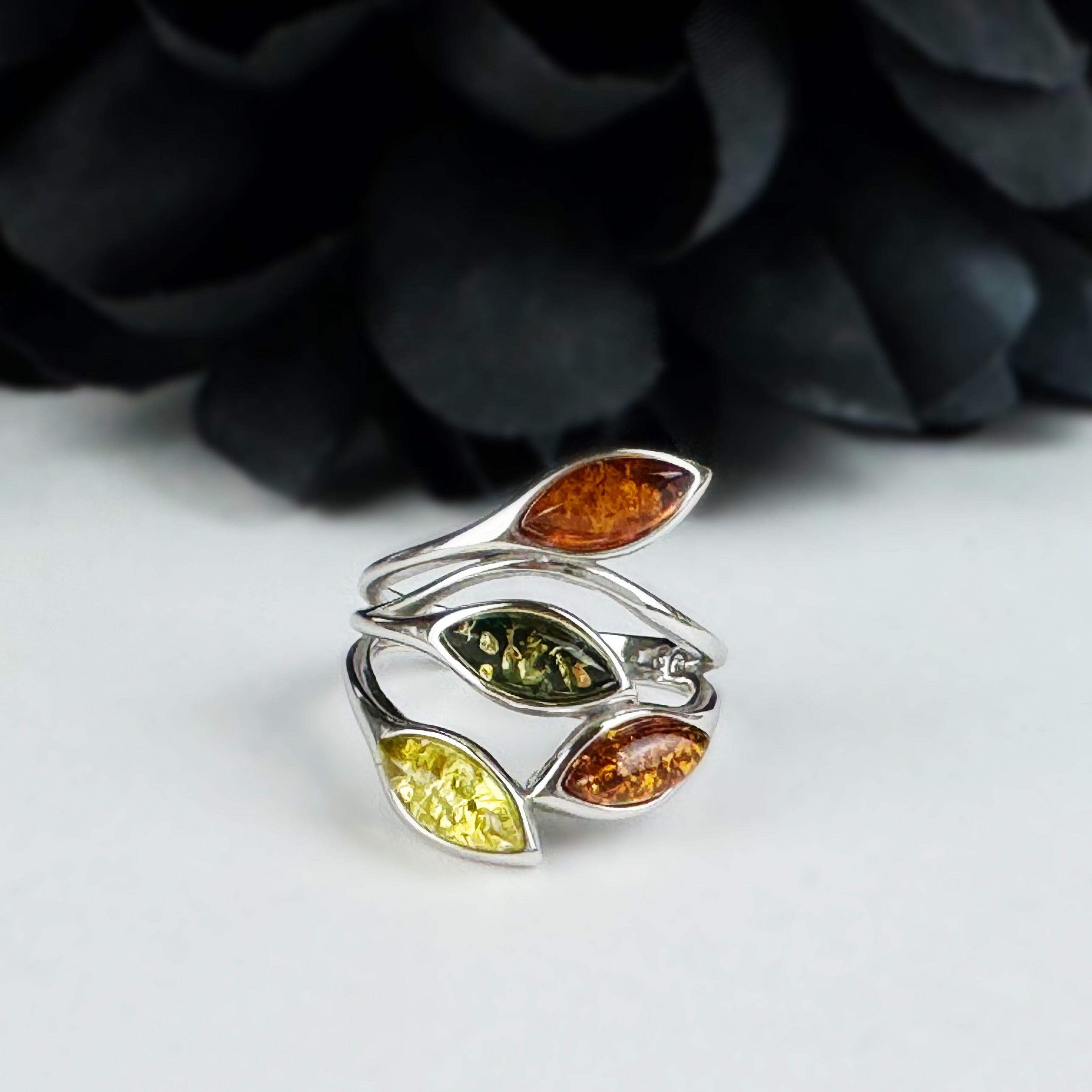 This pretty Silver ring is set with all the colours of falling Autumn leaves with it's Amber shaped stones in forest green, lemon yellow and deep orange that wrap around your finger.
