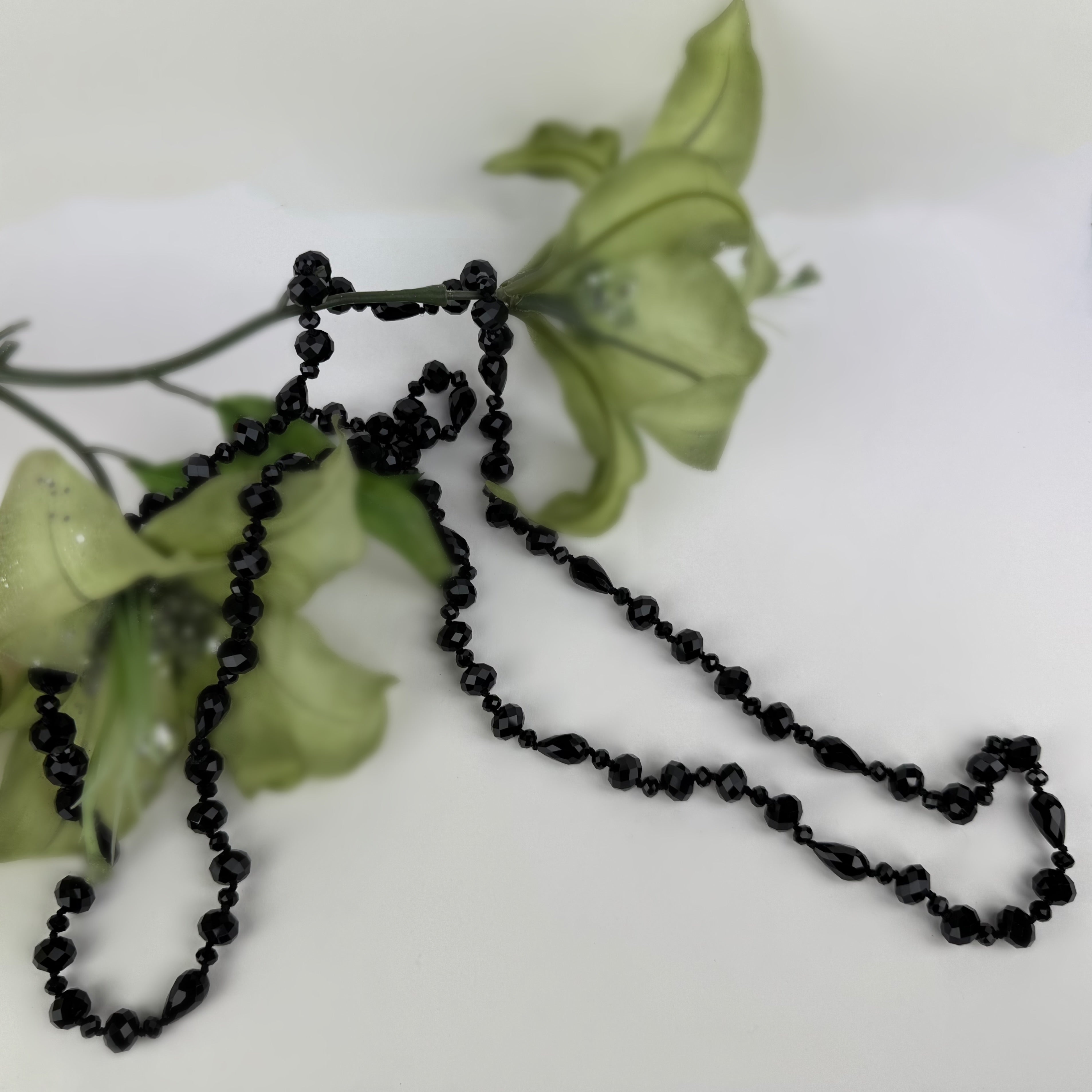 Faceted jet black glass beads sparkle & shine in this long, classic handcrafted necklace which can be worn as a long strand or doubled, even tripled for a myriad of looks.