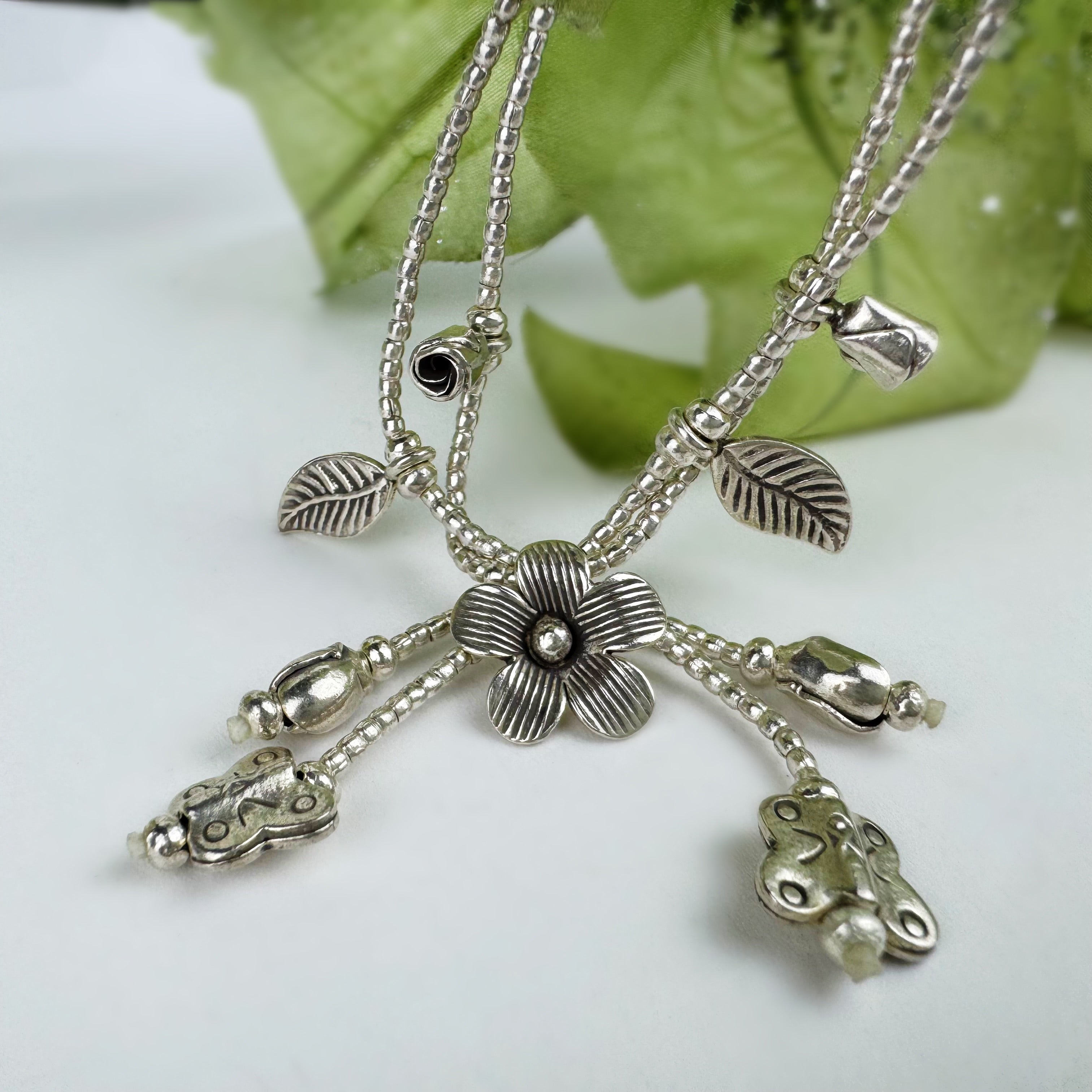Unique & One of a kind. The perfect accessory for Weddings, Fetes & garden parties or even just to brighten your day. This pretty, handmade Silver bracelet has an assortment of different shaped handcrafted Silver beads & charms on a handcrafted ball chain decorated with leaves & butterflies and flowers.