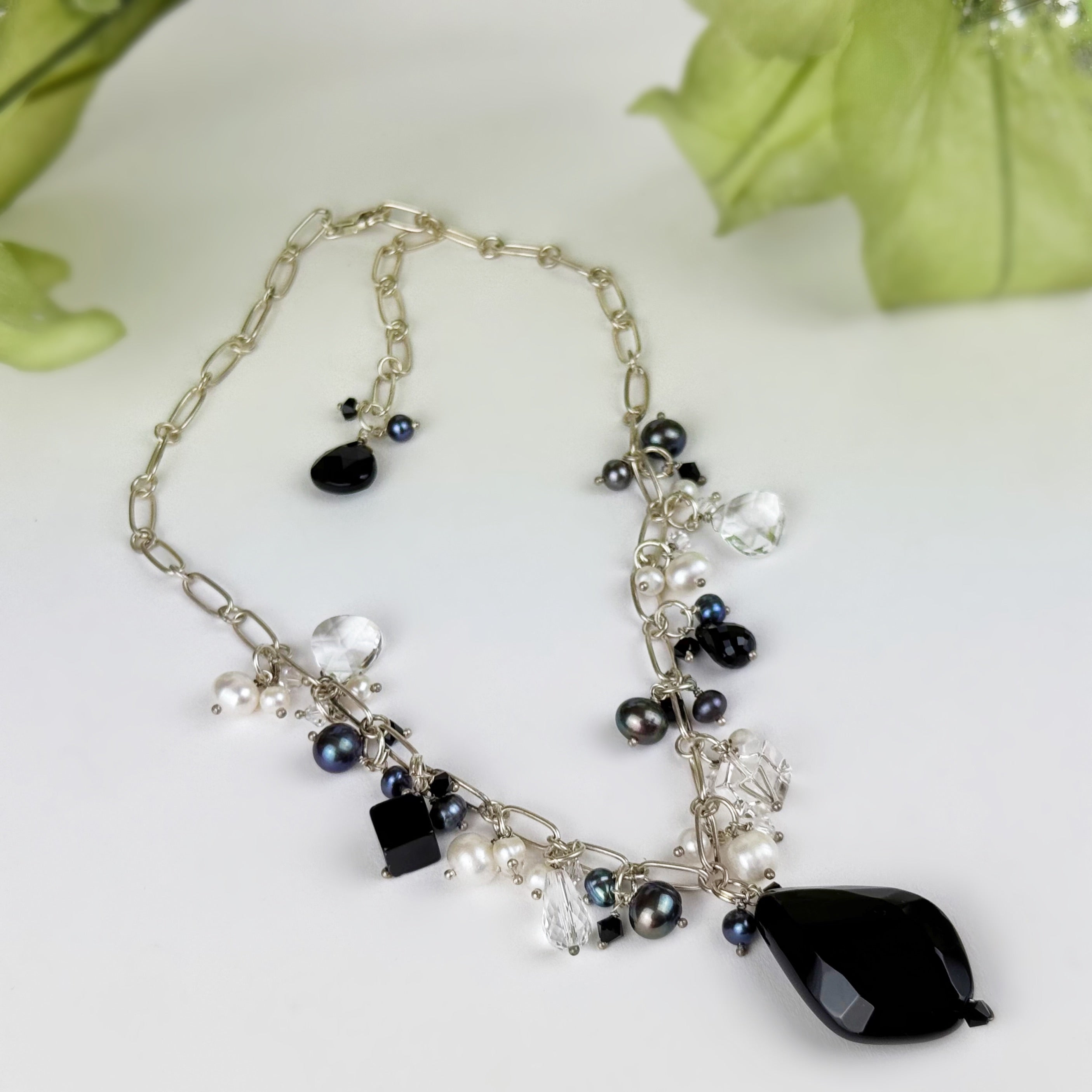 Midnight shades are cleverly crafted together in this handmade Silver & Semi-precious stone necklace. Combining Black Onyx, Quartz Crystal & dark grey & white Freshwater Pearls wear for dark, evening elegance.