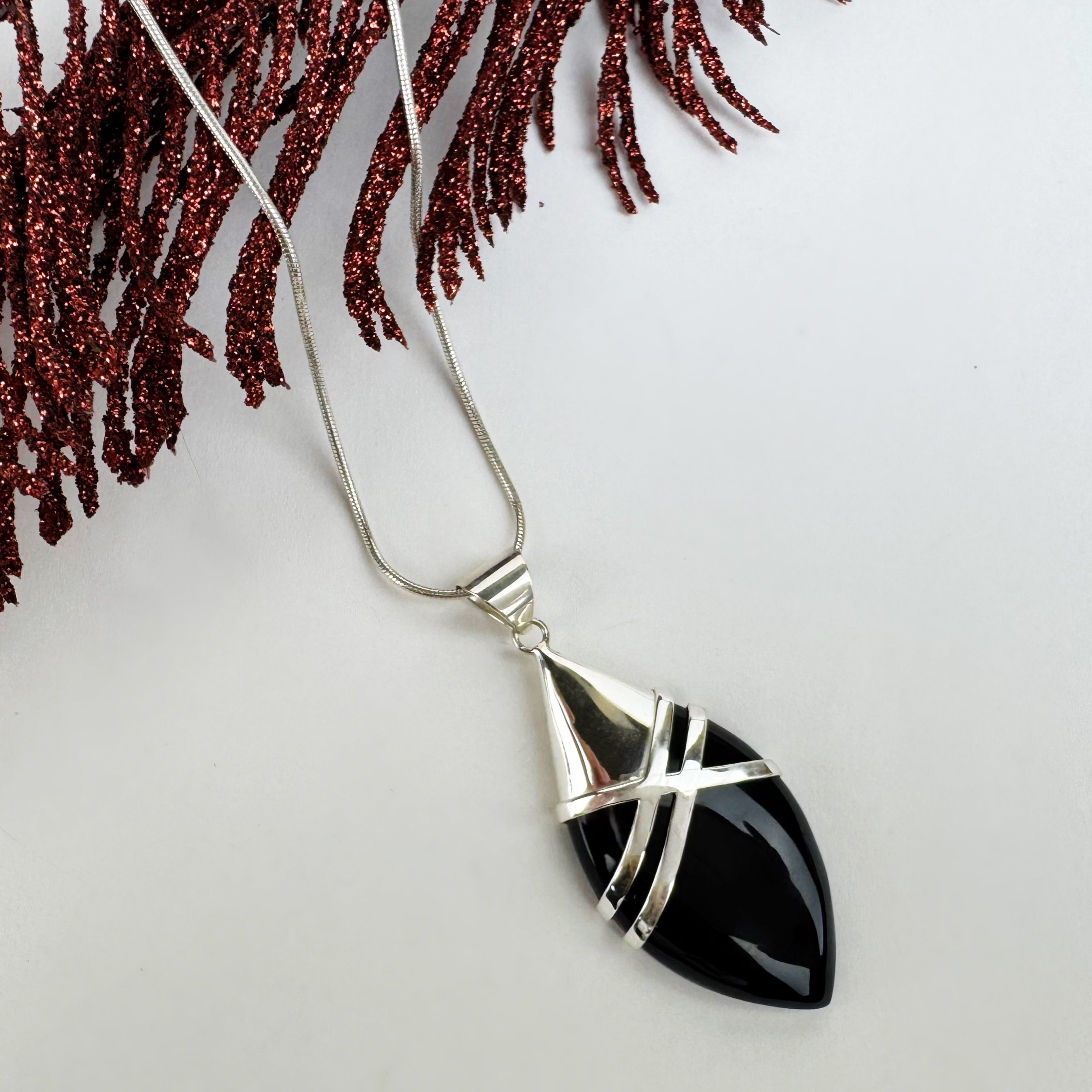 Present an elegant & timeless statement with the Elenore Pendant. This exquisite piece is handcrafted with a criss-cross of Silver adorning this unique elliptical shaped black shell pendant for a captivating piece that is sure enchant.