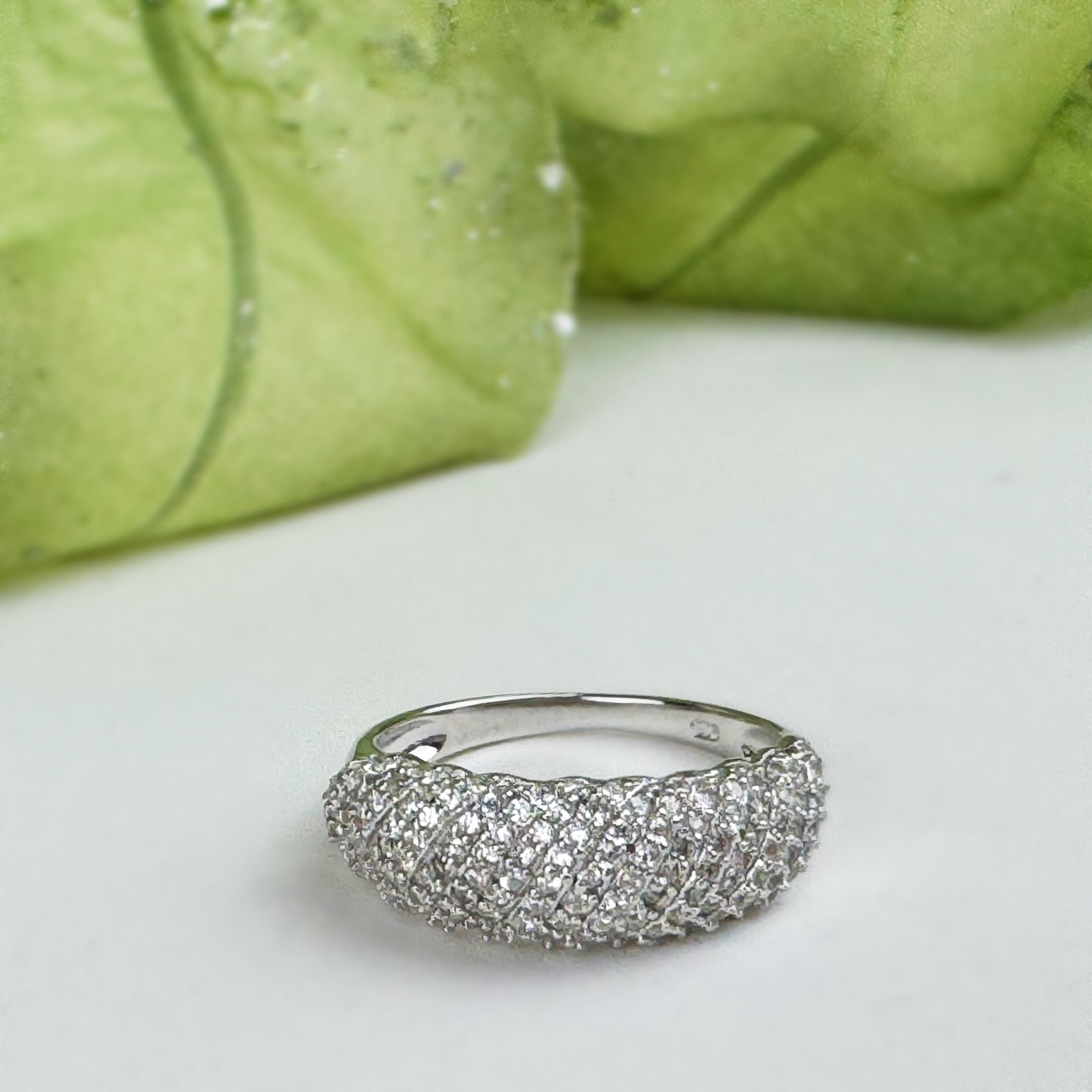 This beautiful Silver ring is set with a twisting sparkle of eye-catching Cubic Zirconia stones that dance in the light with your every move.