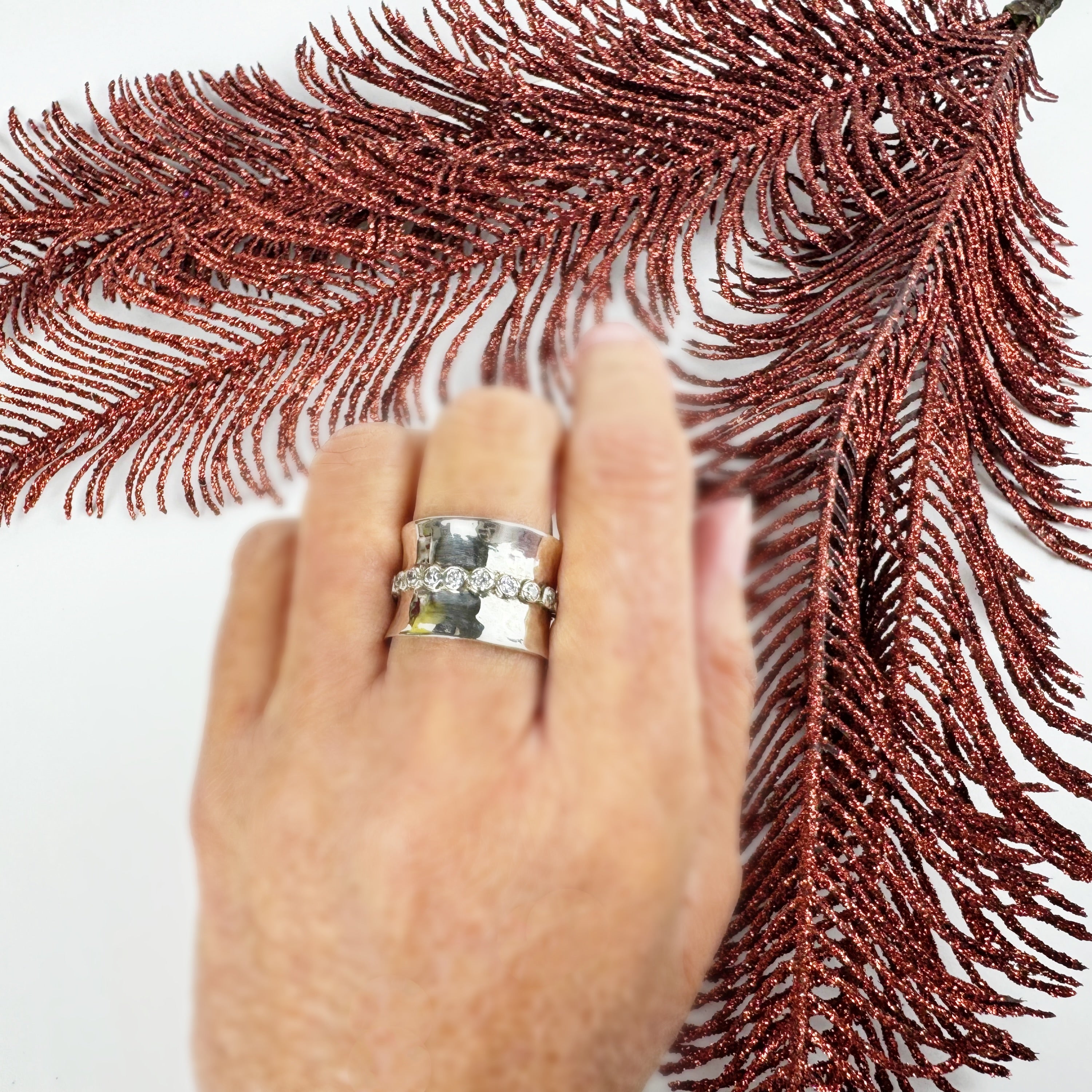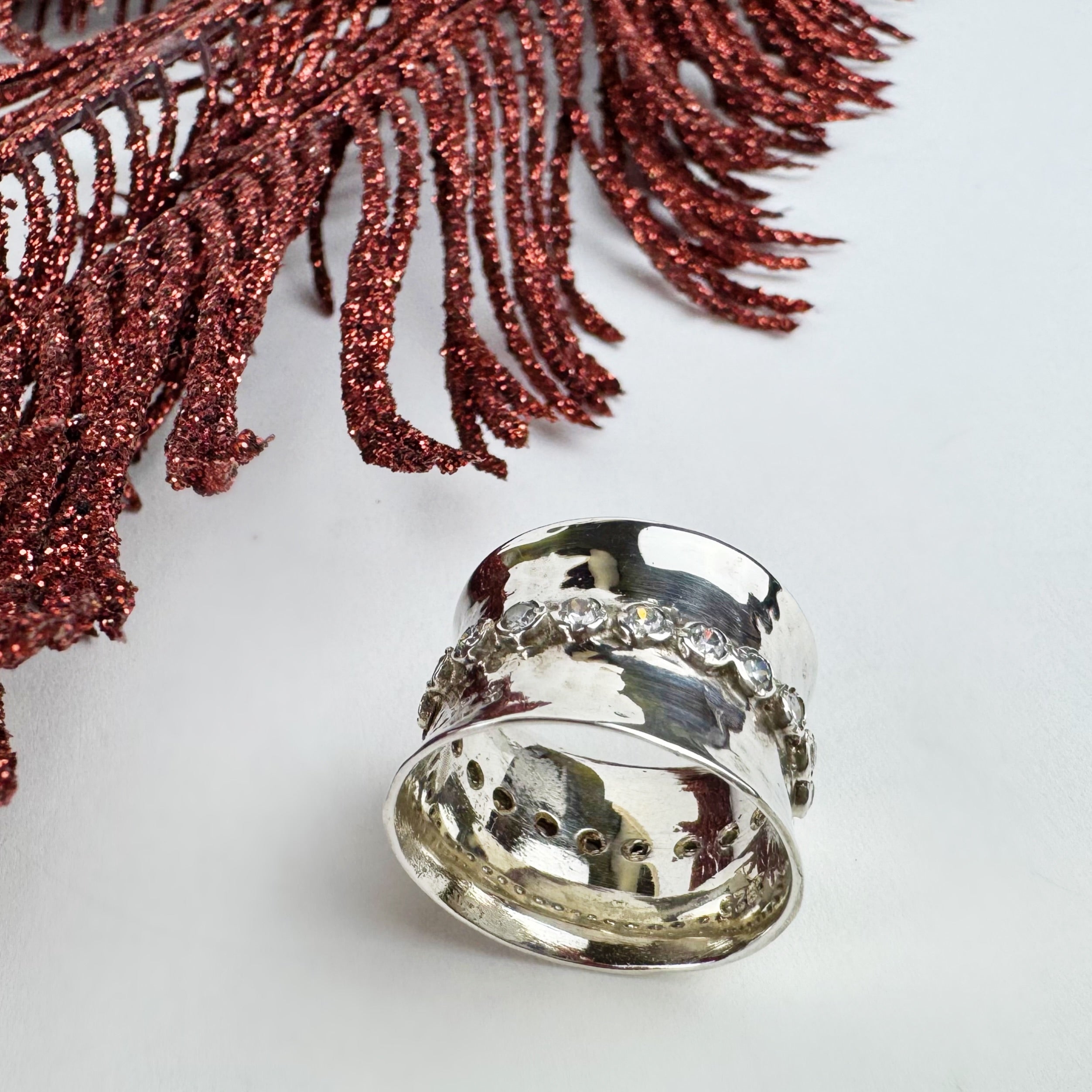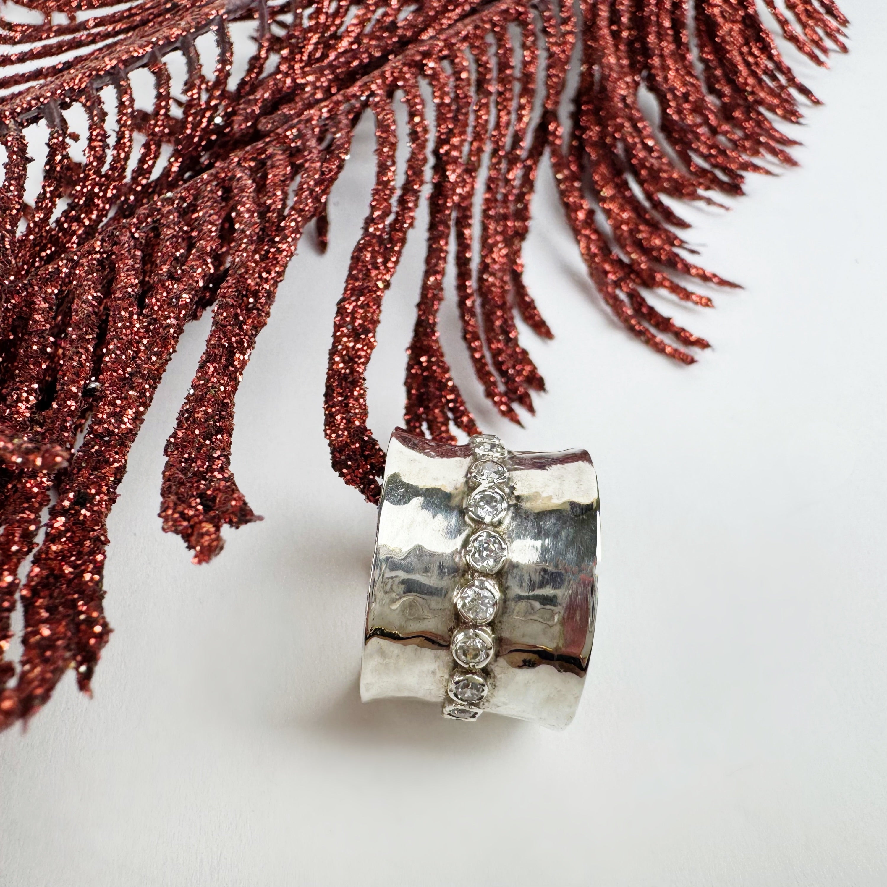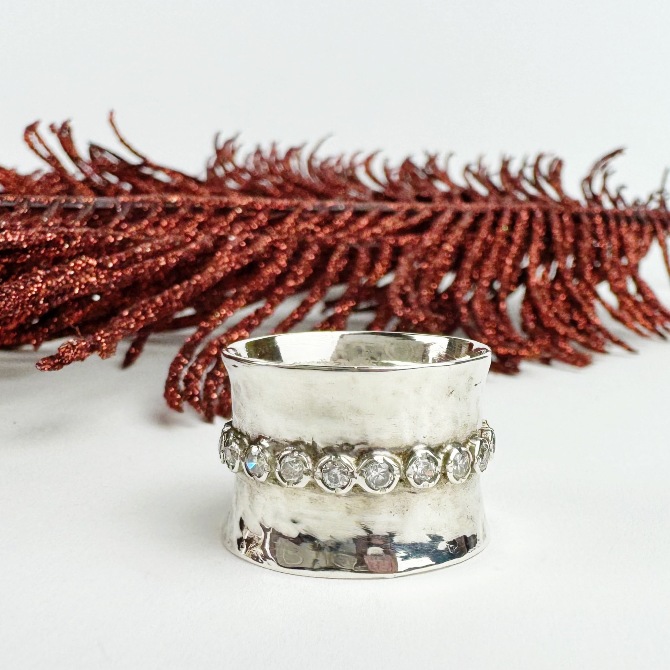 Gorgeous faceted white Zirconia stones shimmer on this wide lightly textured handmade Silver band ring. Creating a glamorous unique look fit for the finest of events !
