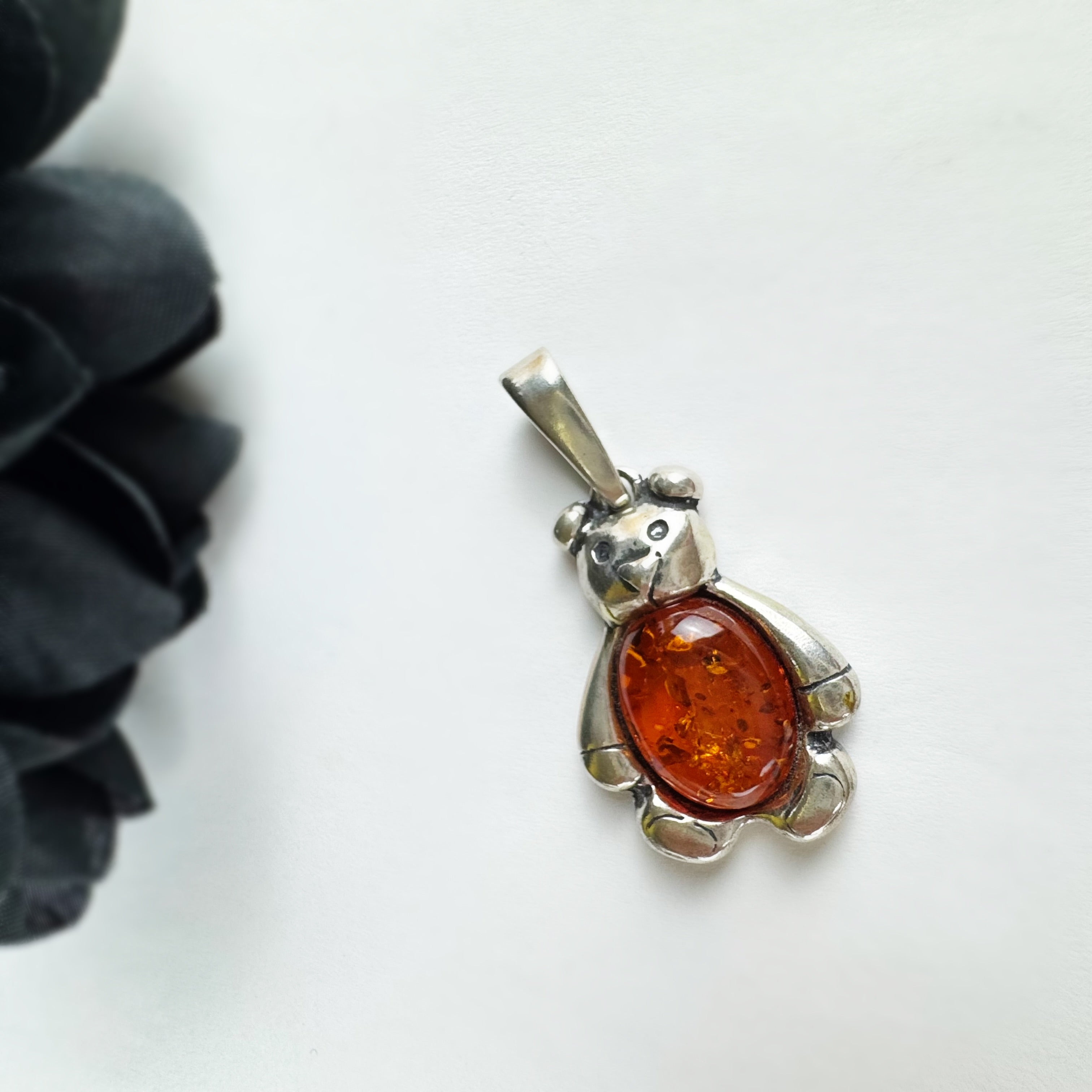 Bring a touch of whimsy to your look with this charming teddy bear pendant, beautifully crafted in Silver & featuring a warm Amber centerpiece. Its playful design makes it a delightful accessory for everyday wear or a unique gift for someone special.