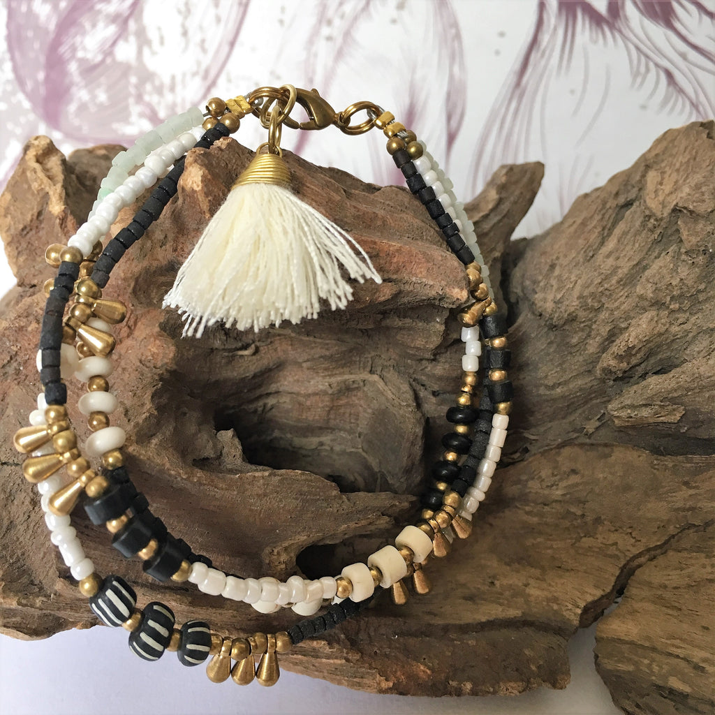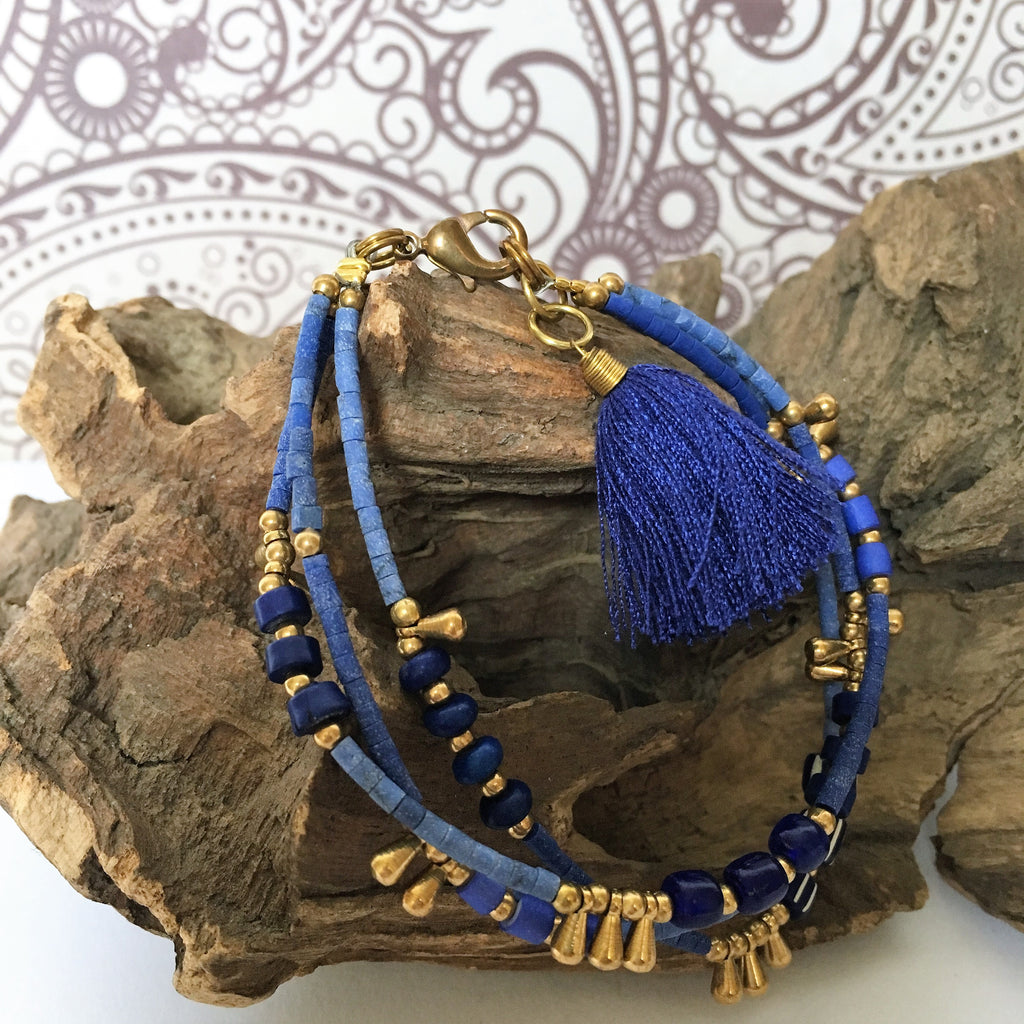 Three strands of brightly coloured beads finished with a fun, silken tassel. Choice of 4 colours.