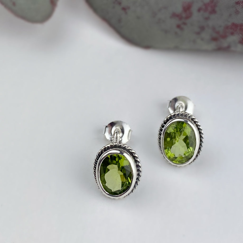 Pretty oval stud earrings of brightly coloured, lime green faceted Peridot are set in a simple yet highly wearable handcrafted Silver rope design setting.