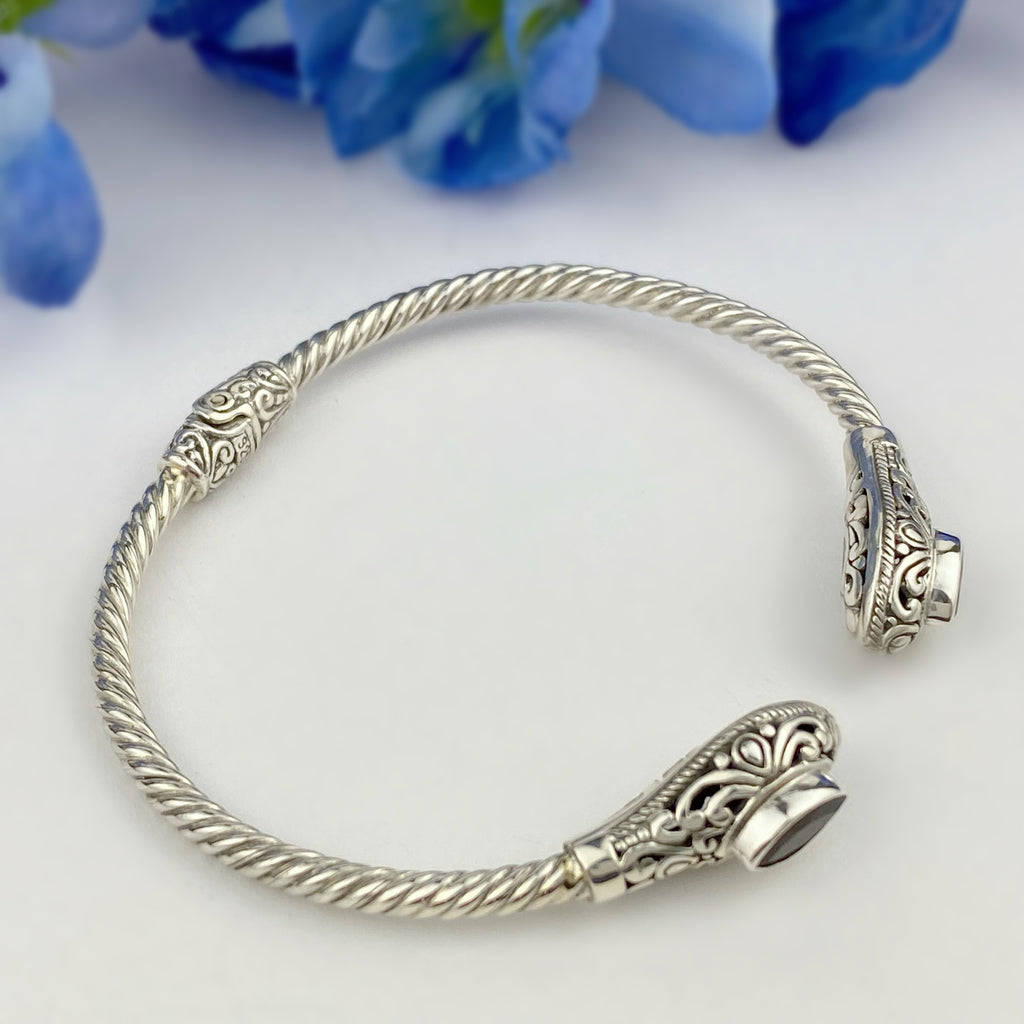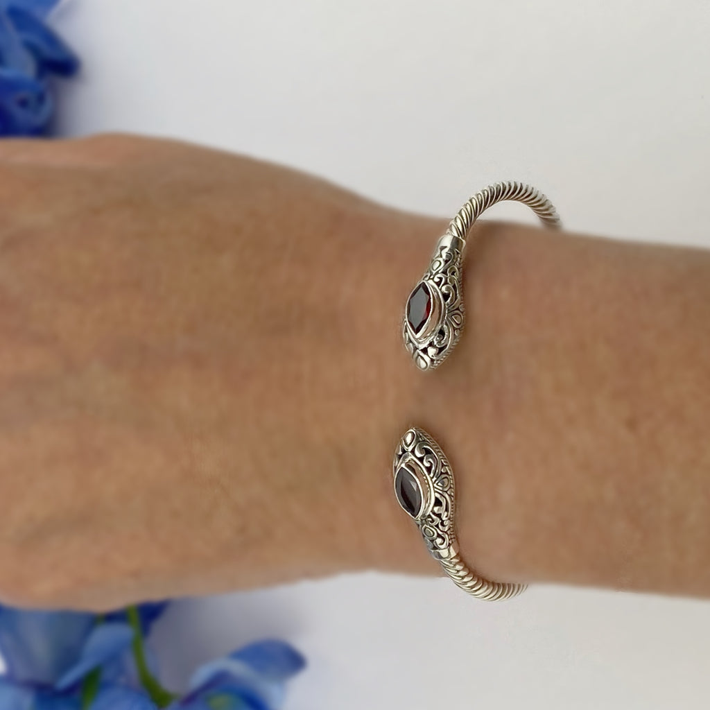 Named after the sky with mars the red planet as the Fire element, this delicate, faceted Garnet bangle sparkles brilliantly in the light. Artisan crafted the Silverwork fascinates and with a hinged fastening is suitable for most wrist sizes.