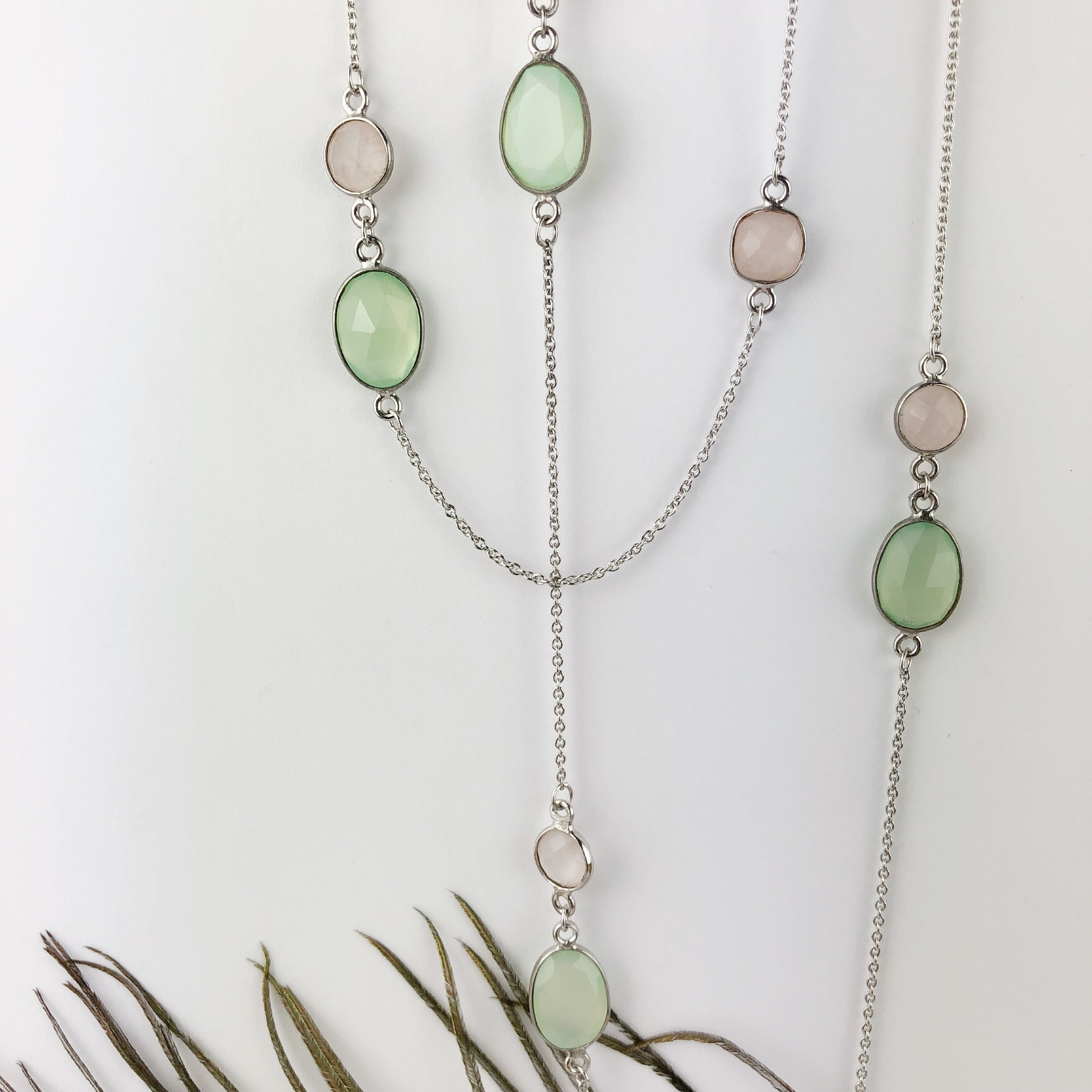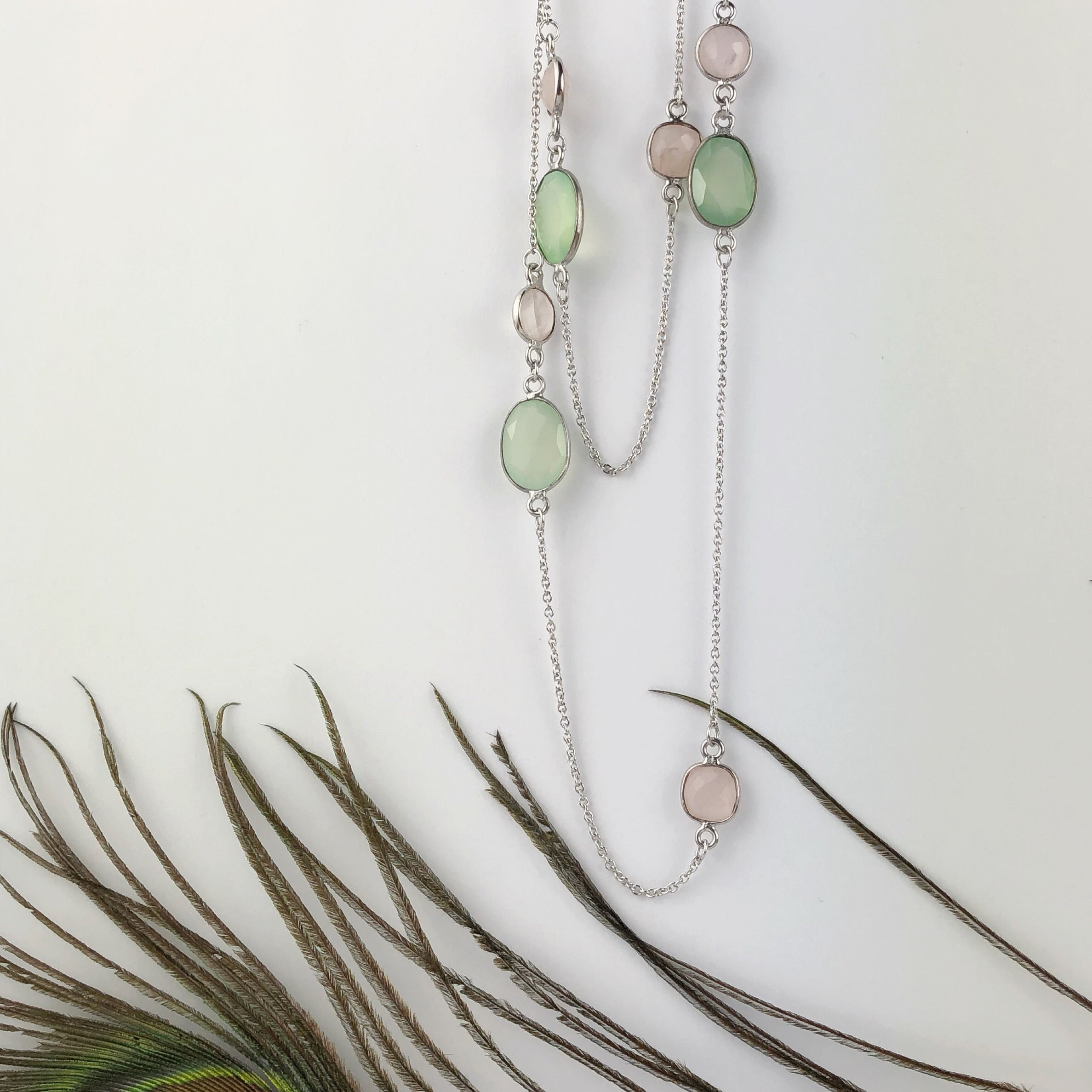 Pastel pink Rose Quartz and mint green Chalcedony make a feminine Spring statement combined in this long Silver and stone chain necklace. In a length that can be wrapped twice or worn long this elegant necklace will suit an assortment of necklines.