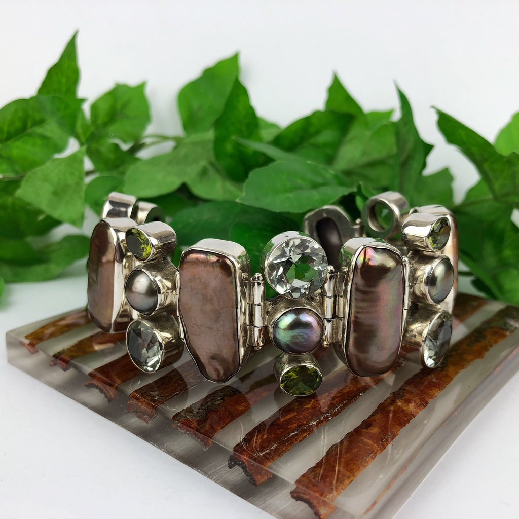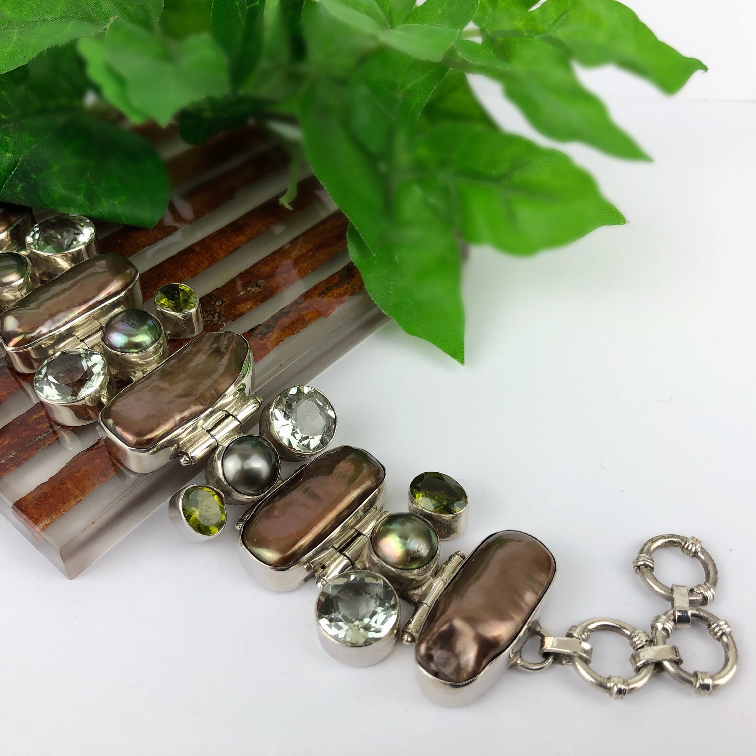 Luxurious bronze toned Biwa Pearls drape elegantly around the wrist in this striking One of a kind Silver and stone bracelet. Interspersed with faceted Green Amethysts, Peridot stones and petrol grey Freshwater Pearls this handmade bracelet design is a head turner.