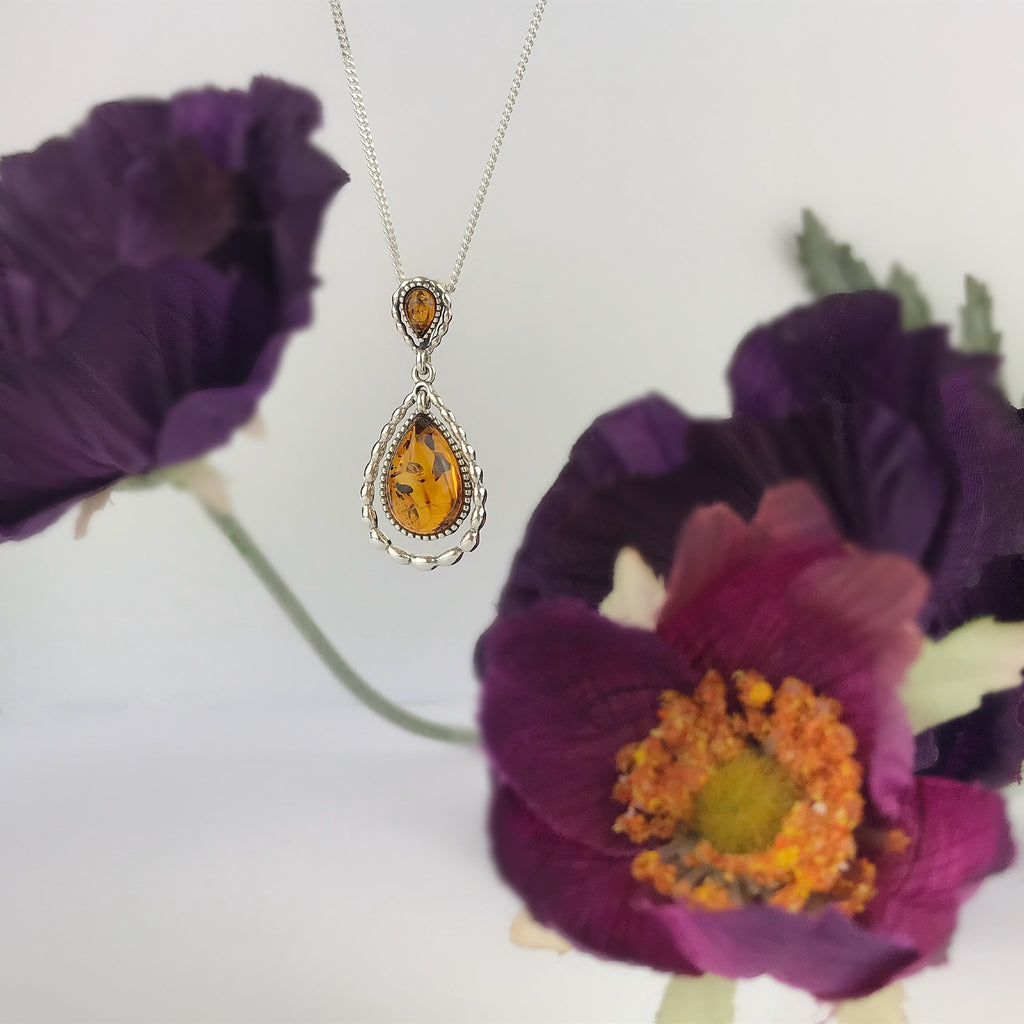 With a hint of a bygone era this antique style Amber and Silver pendant will add a touch of warm, vintage elegance.