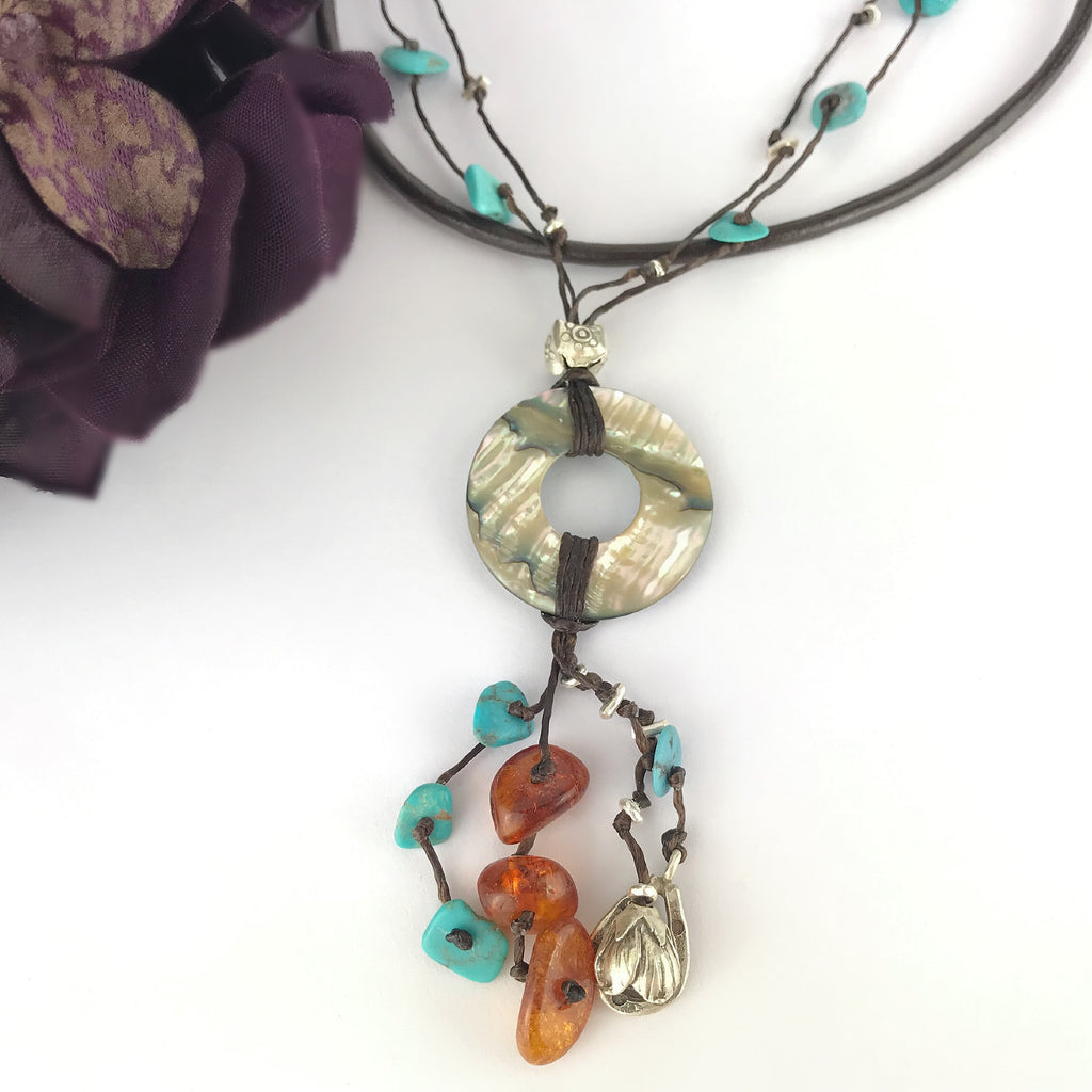 For an exotic beach holiday, a touch of festival boho chic or just bare foot glamour this unusual handmade necklace has it all. Bright blue Turquoise stones entwine with leather, handcrafted Silver beads and clasp and the iridescence of natural Abalone shell for tropical accessorizing.