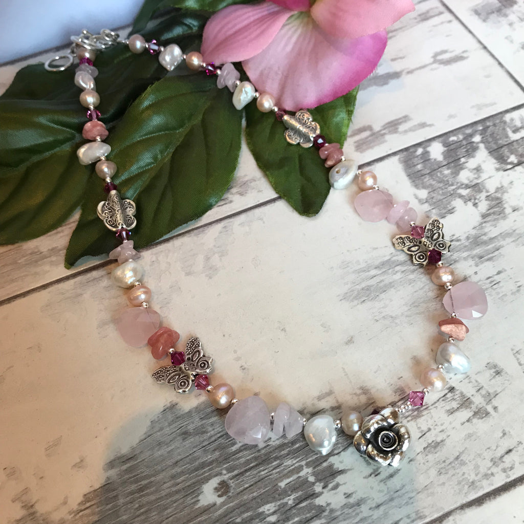This pretty, handmade necklace delights, with semi-precious natural stones of Rose Quartz, Rhodochrosite and Freshwater Pearls interspersed with sparkling pink crystals and handcrafted Silver butterflies and flowers.