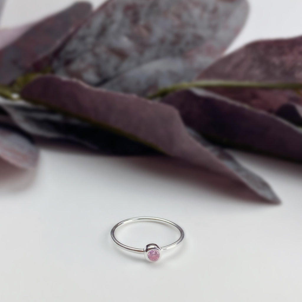 Worn alone or stacked with others with it's bright, eye catching sparkle this simple Silver set pink Cubic Zirconia ring adds a Pink Tourmaline style dazzle to everyday looks, & makes a perfect gift for an October Birthday.