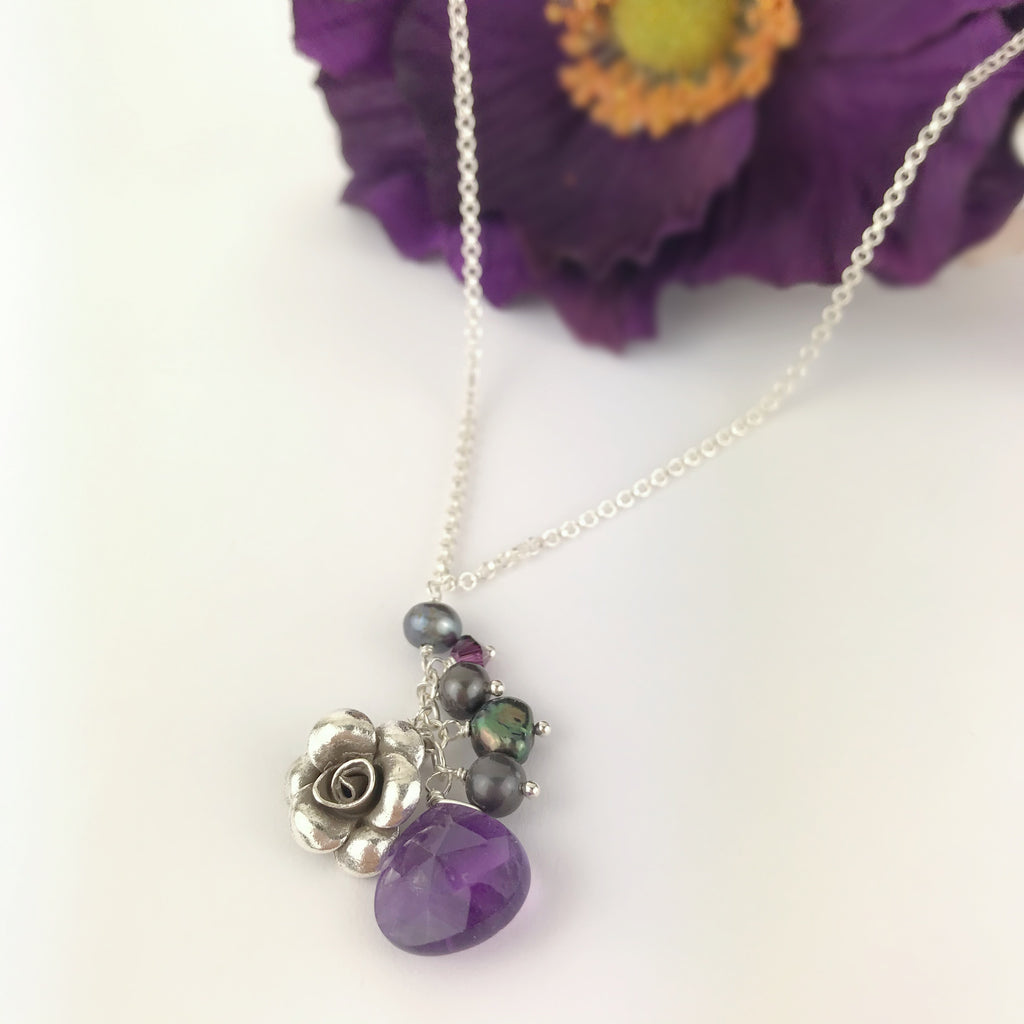 This unusual Silver pendant is so pretty to wear. Handcrafted with semi-precious natural stones of Amethyst and iridescent grey Freshwater Pearls interspersed with sparkling crystals and handcrafted Silver flowers.