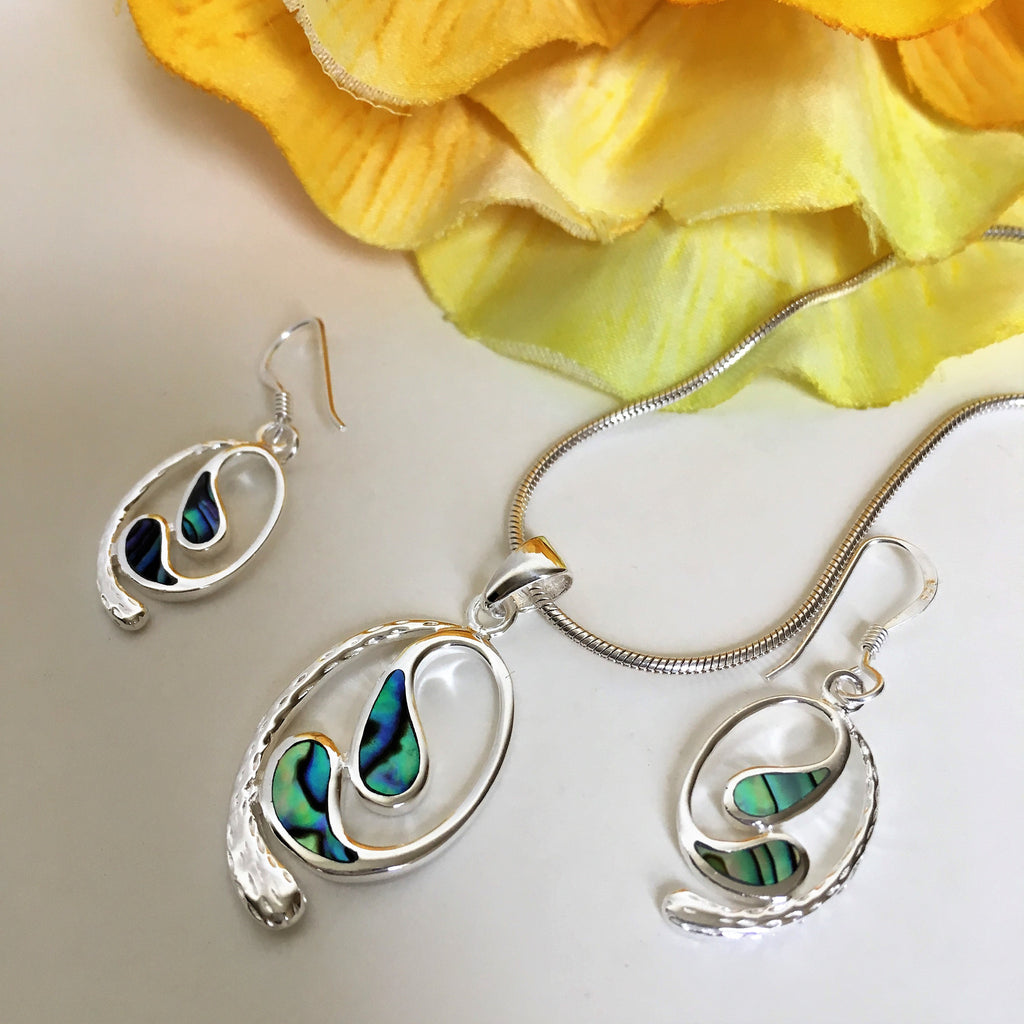 This unusual shaped textured Silver and Black Onyx pendant and earring set reminds us of the natural movement of the ocean as waves build,crest and break over each other on their journey towards the shore.
