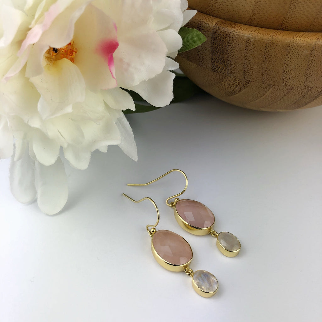 Pastel pink Rose Quartz and delicately tinted Rainbow Moonstone create a combination of vintage femininity. Complimented by a setting of Gold plated Silver these duo stone drop earrings are a garden party must have.