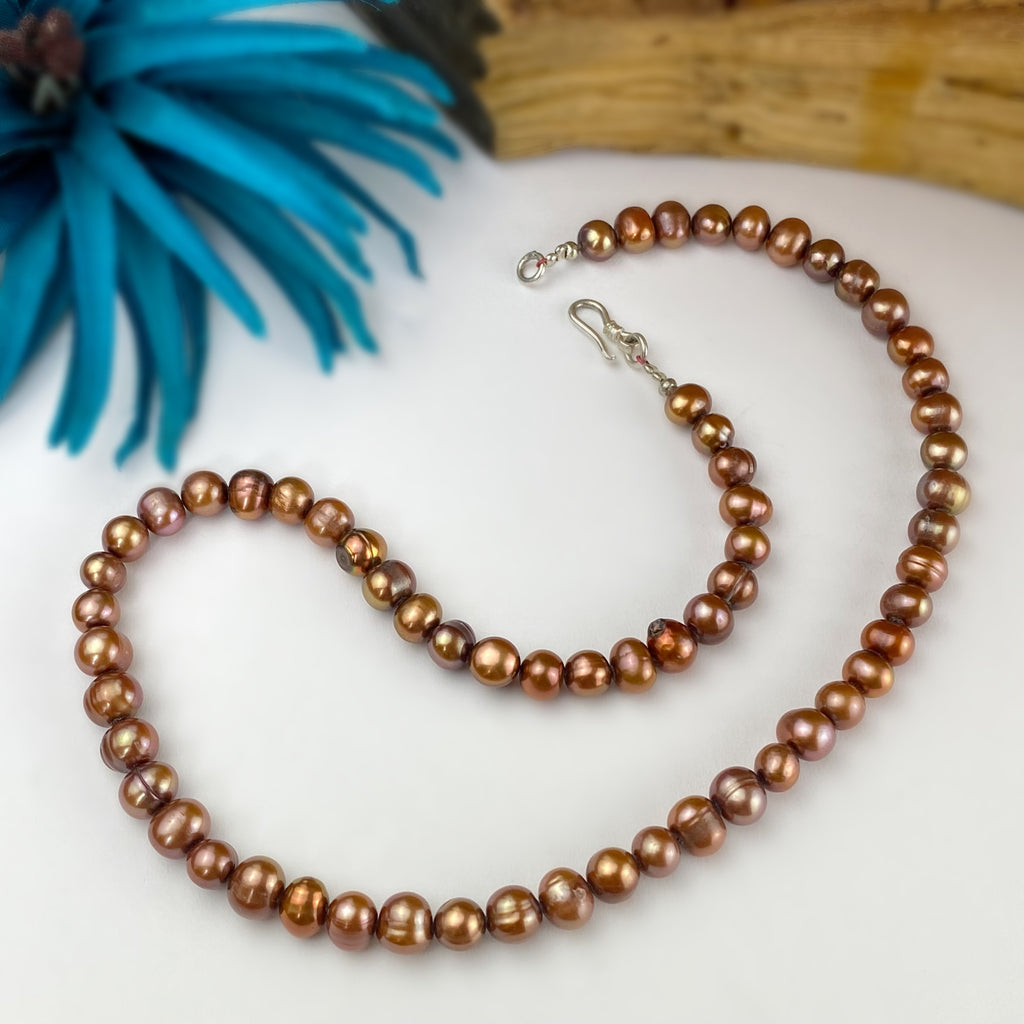 With a fiery reddish brown colour this Freshwater Pearl necklace glows with a seasonal warmth & lustre.