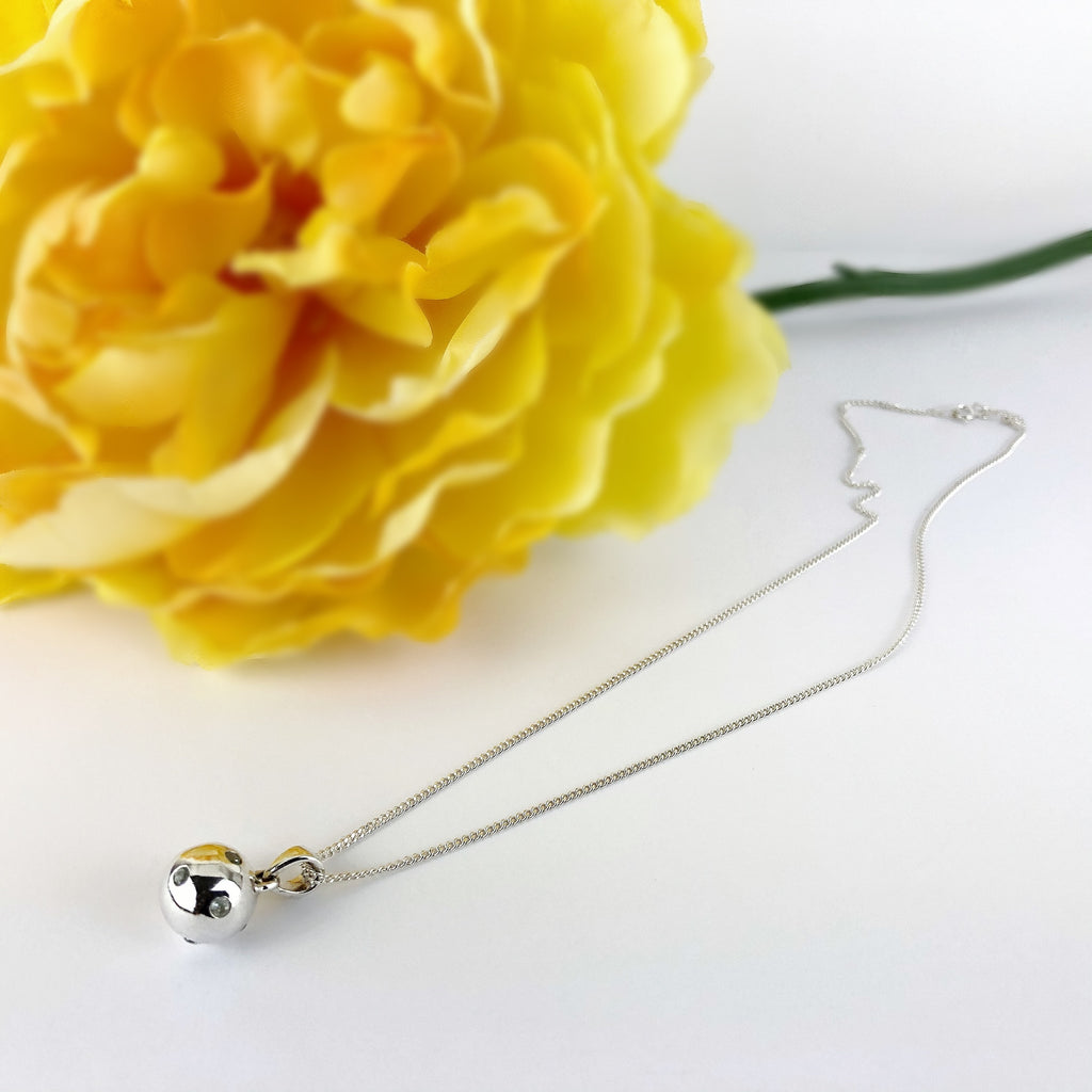 A Silver sphere decorated with tiny dainty sparkling Blue Topaz facets swings delicately at your neck.