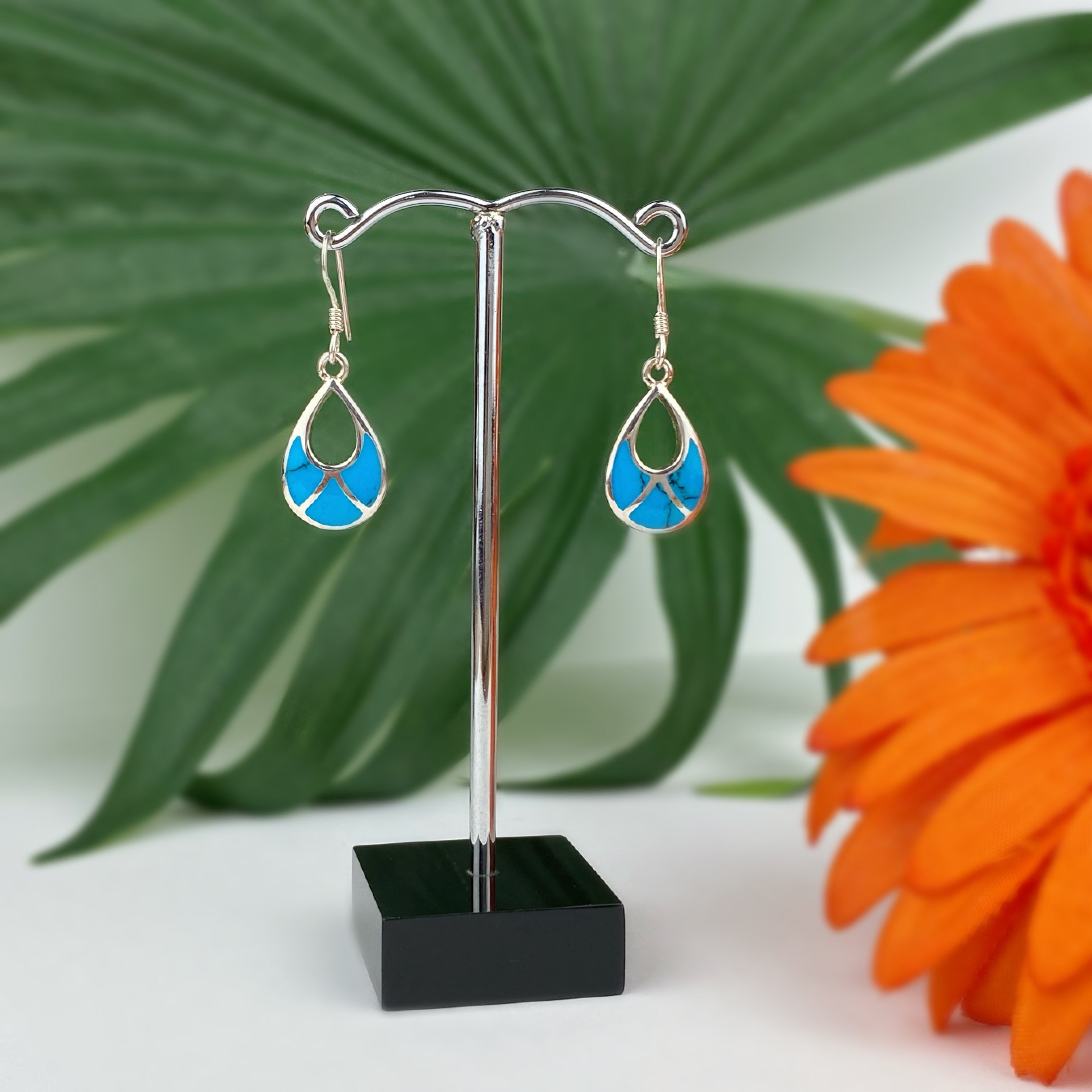 These classic drop earrings feature bright blue Turquoise in Silver. This lovely design is sculpted to resemble a modern art deco tulip shape & looks great with most necklines & styles.