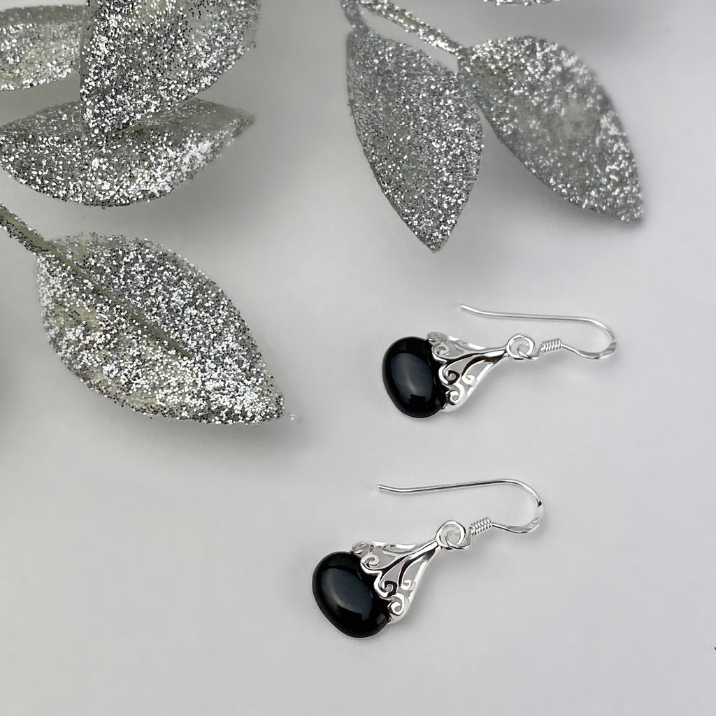 These drop earrings feature swirls of Silver, holding stones of Black Mother of Pearl for vintage Art Nouveau elegance.